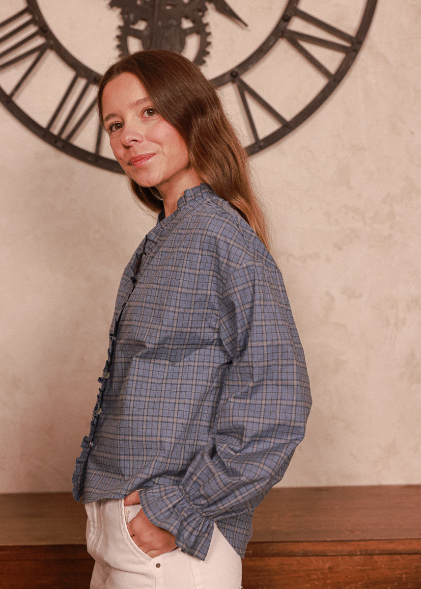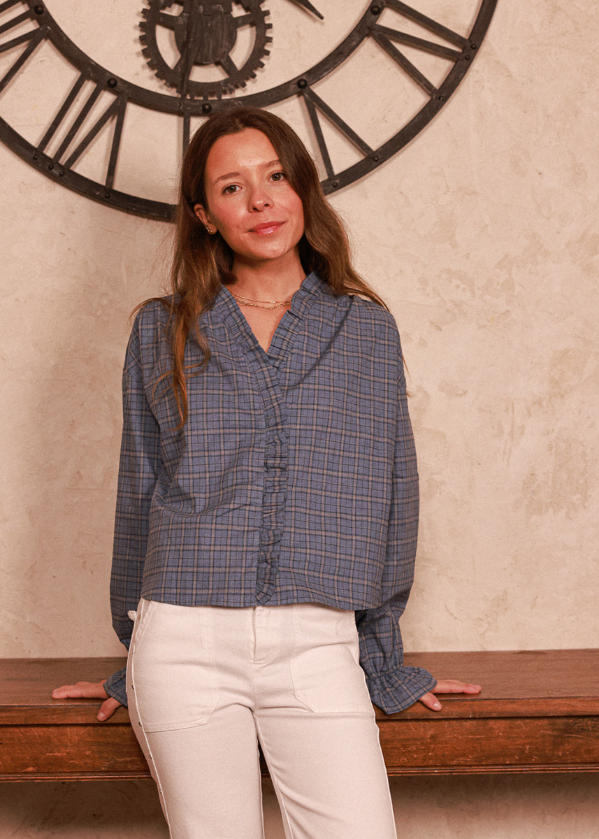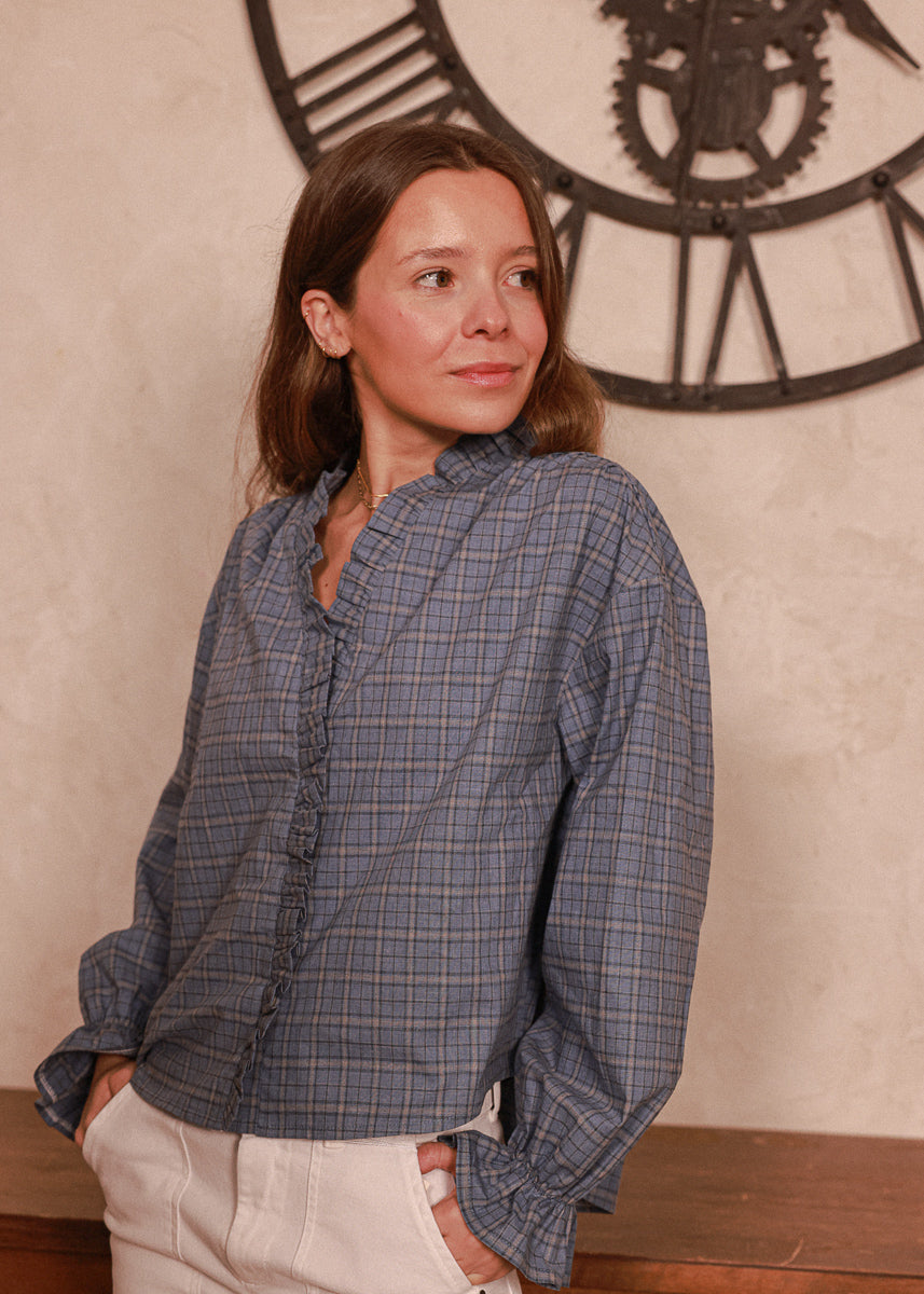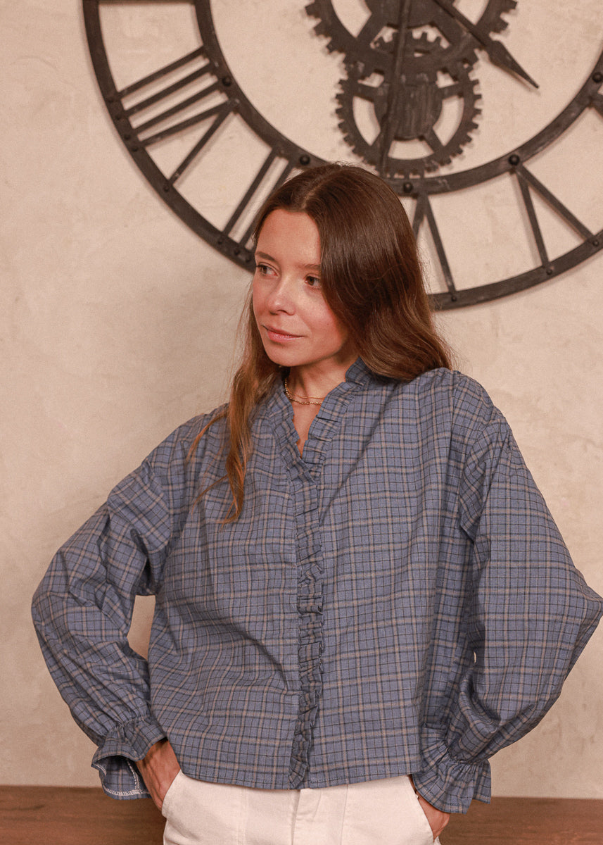 Blusa en color azul con estampado de cuadros, cuello camisero y cierre frontal de botones. Corte recto y puños fruncidos.