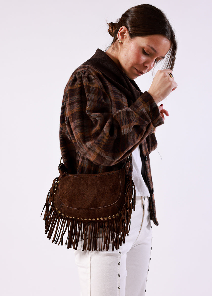 Bolso marrón oscuro de ante con detalle de tachuelas y flecos. Cierre con cremallera. Correa ajustable.