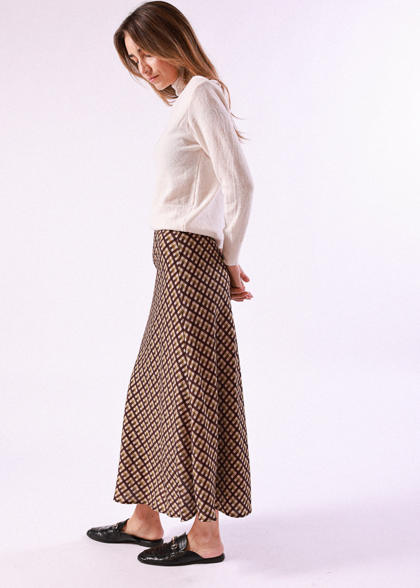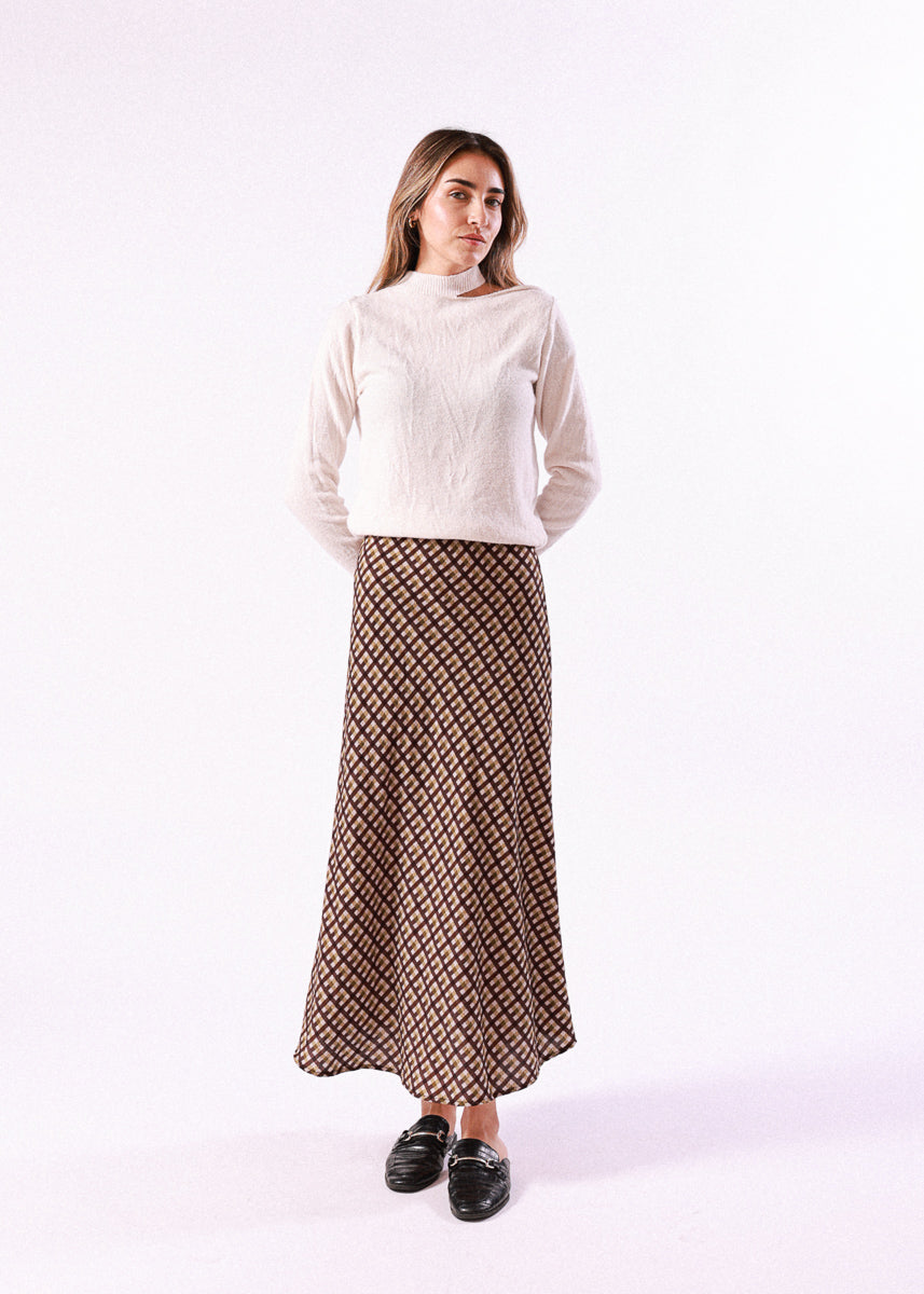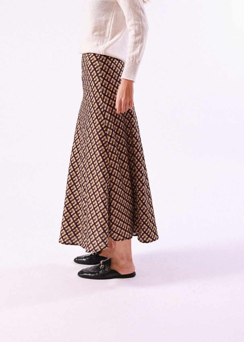 Falda larga con diseño de cuadros y caída fluida. De cintura alta y corte recto ligeramente evasé.