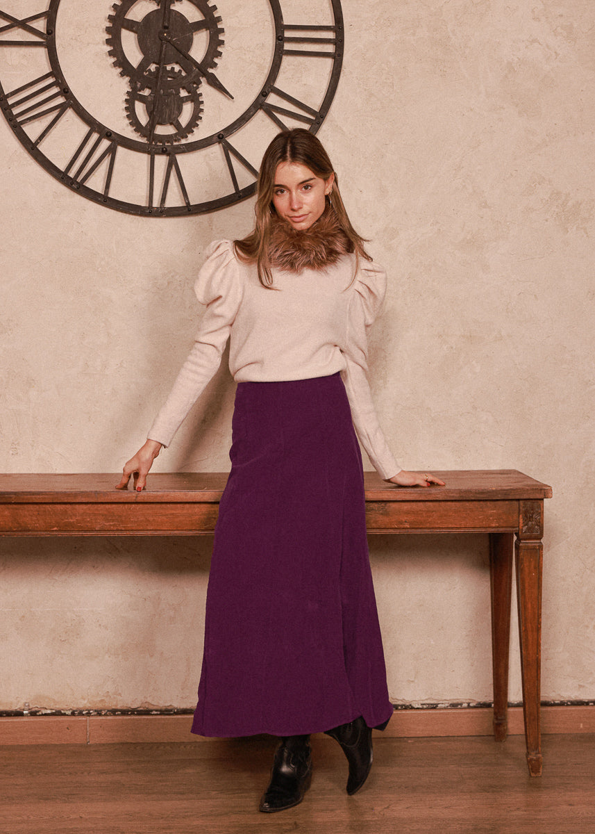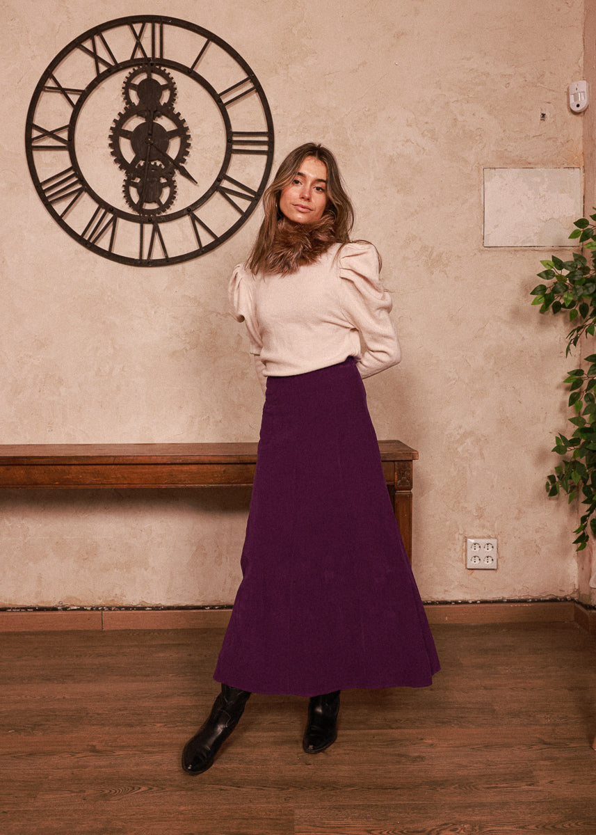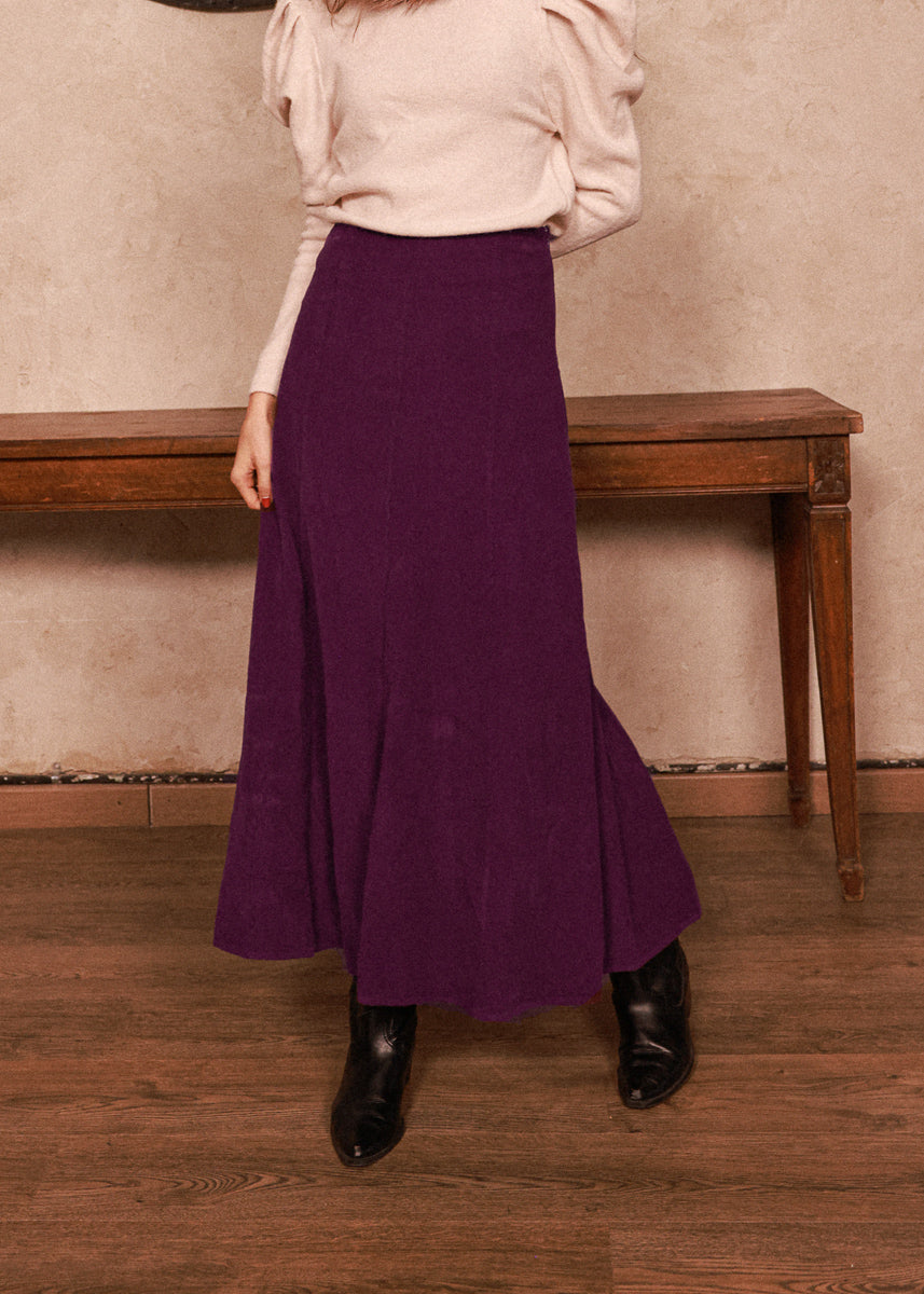 Falda larga morado oscuro de micro pana con costuras verticales. Tiene cremallera en lateral.