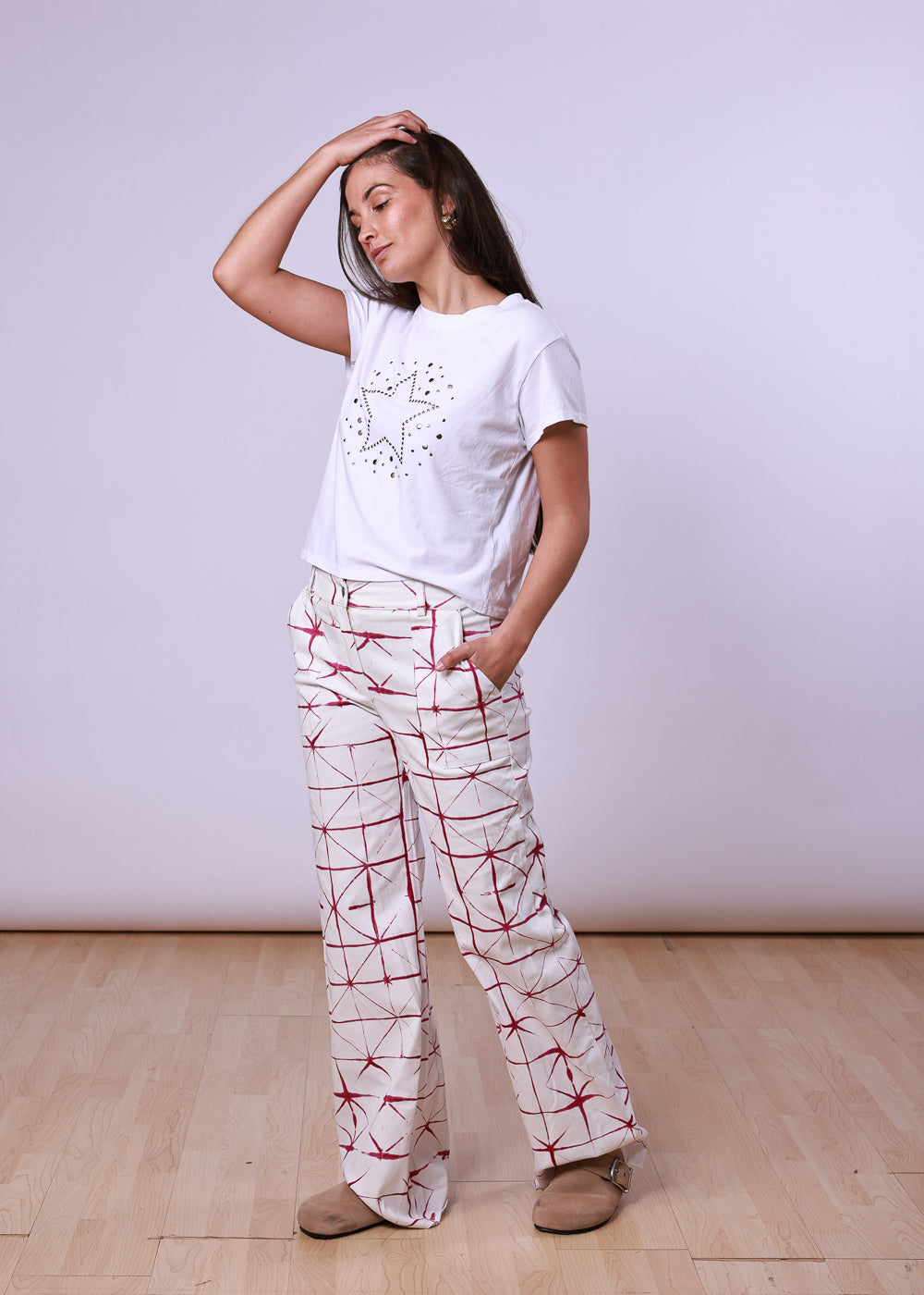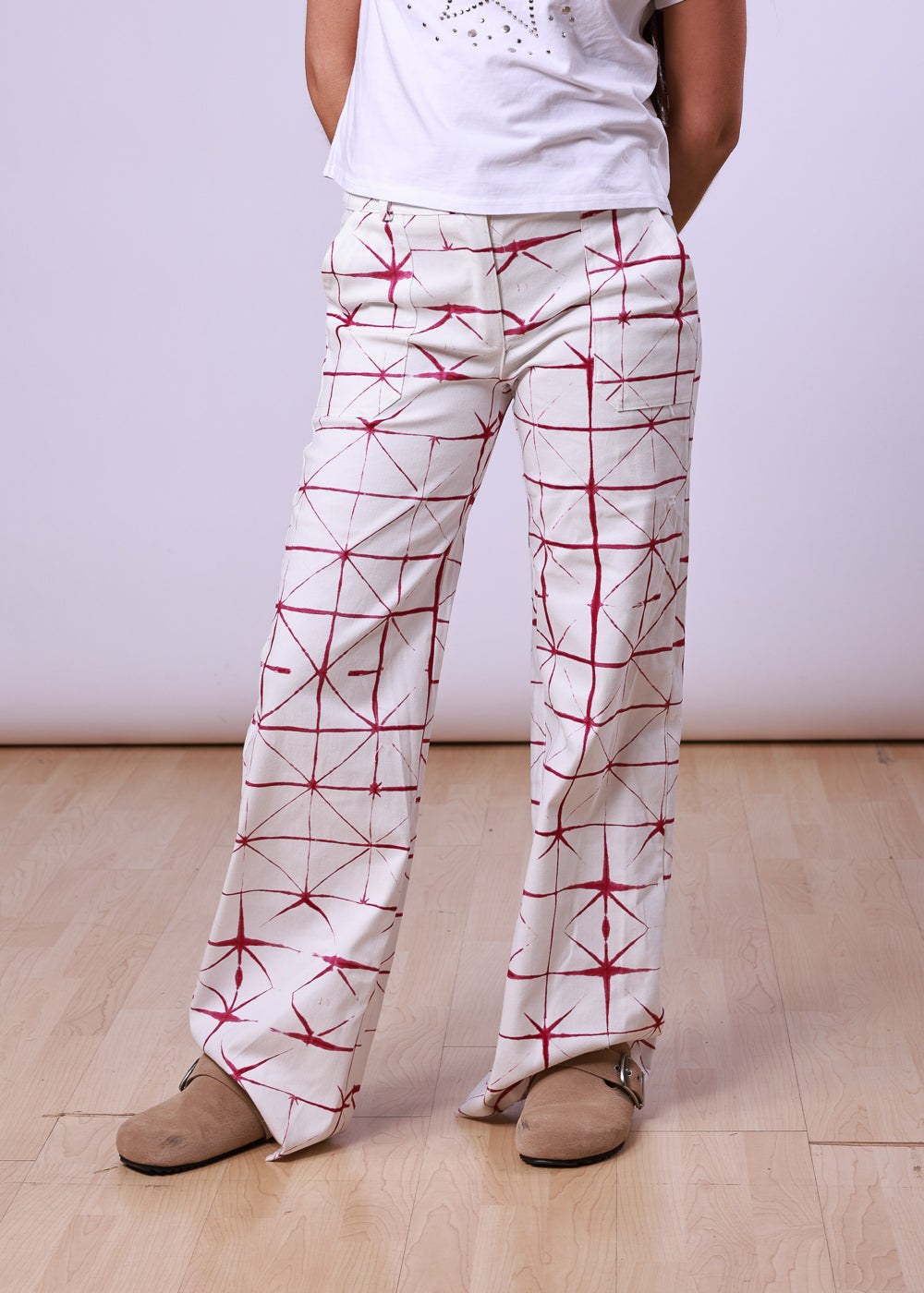 Pantalón blanco de corte amplio con estampado geométrico en color rosado.
