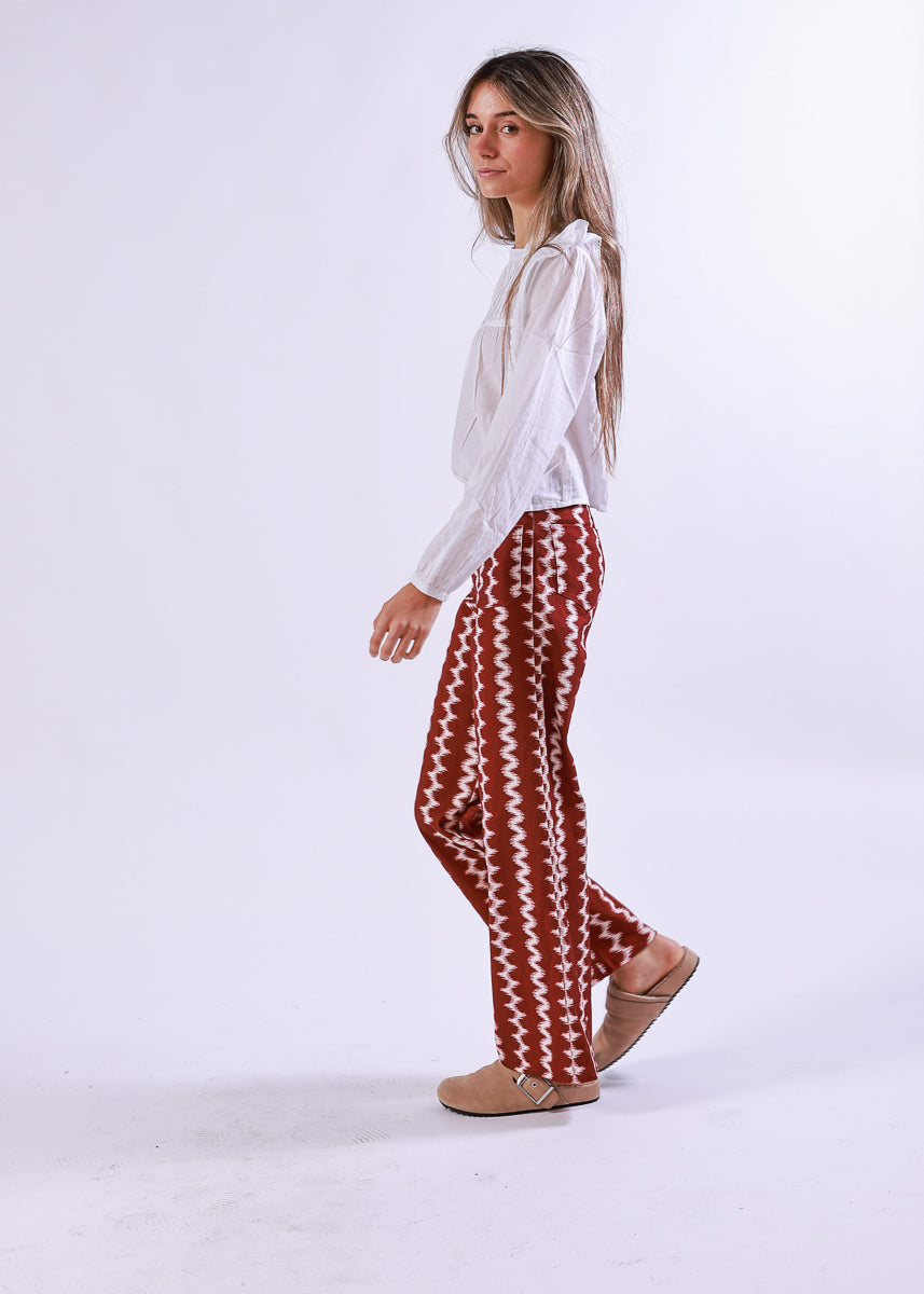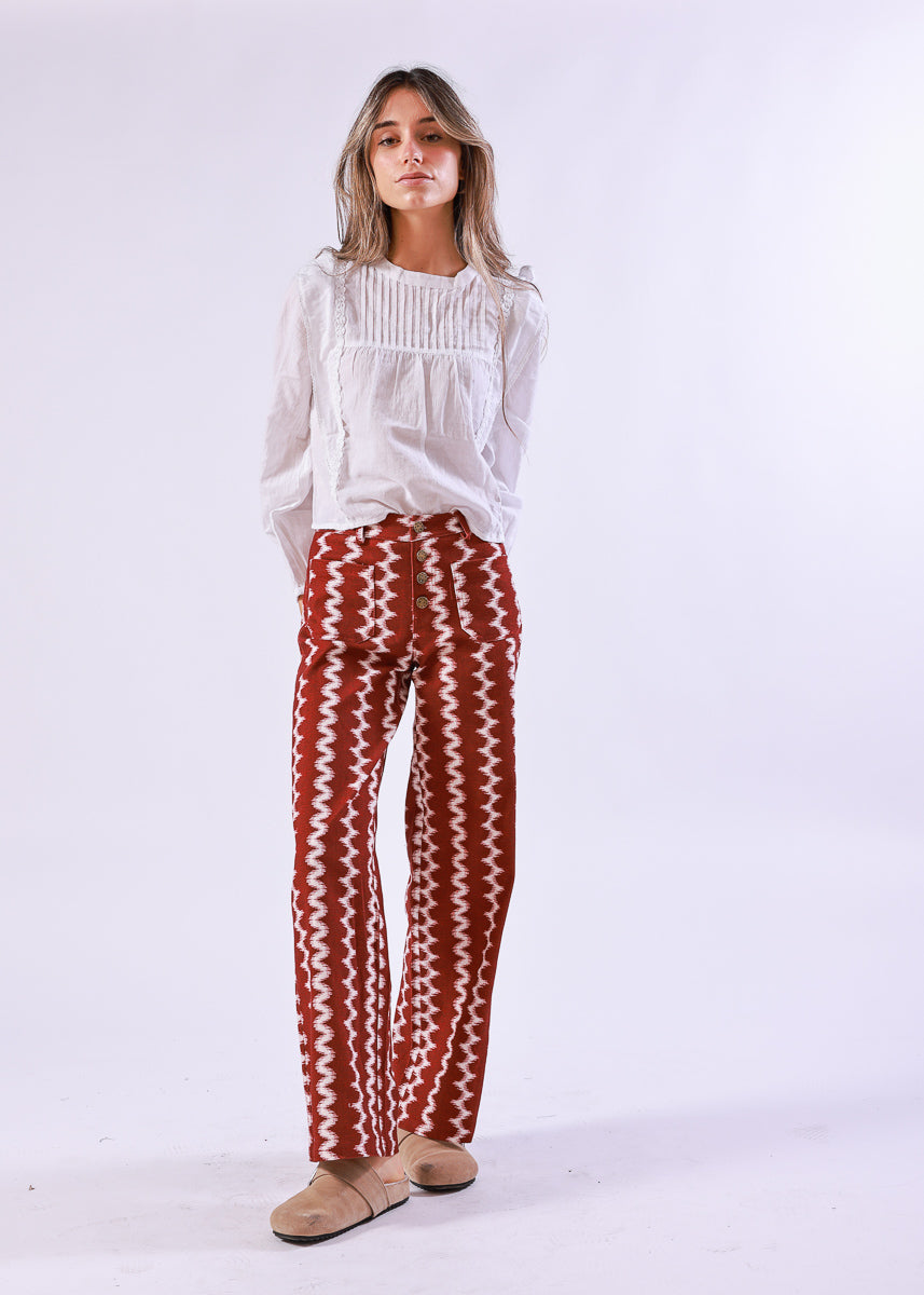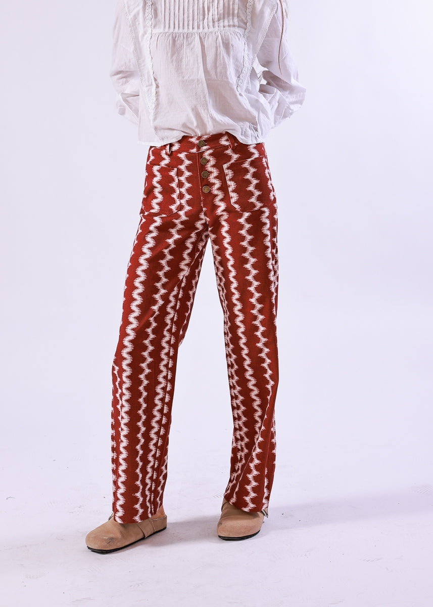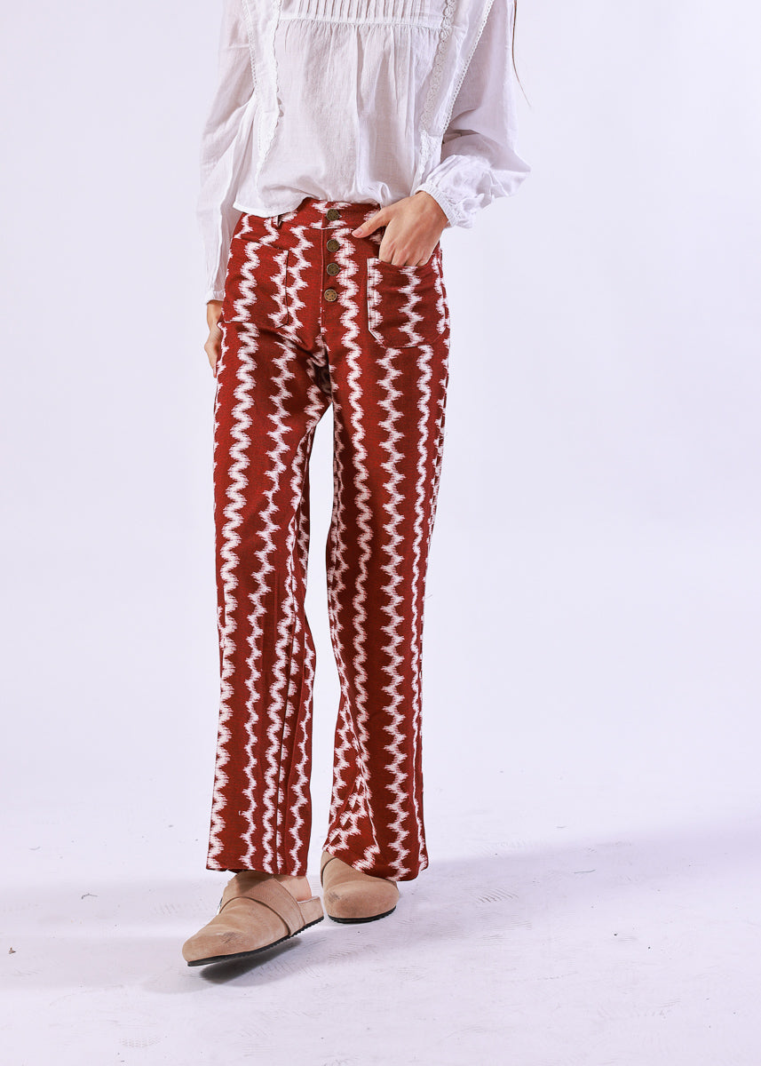 Pantalón de tiro alto con estampado zigzag en tonos rojo y blanco. Corte recto, bolsillos delanteros y cierre frontal con botones visibles.