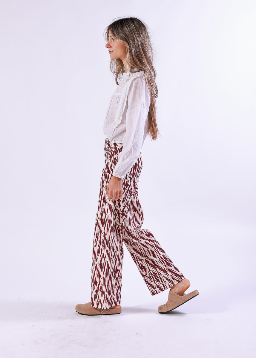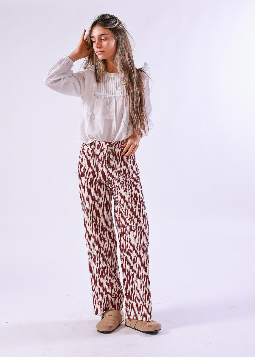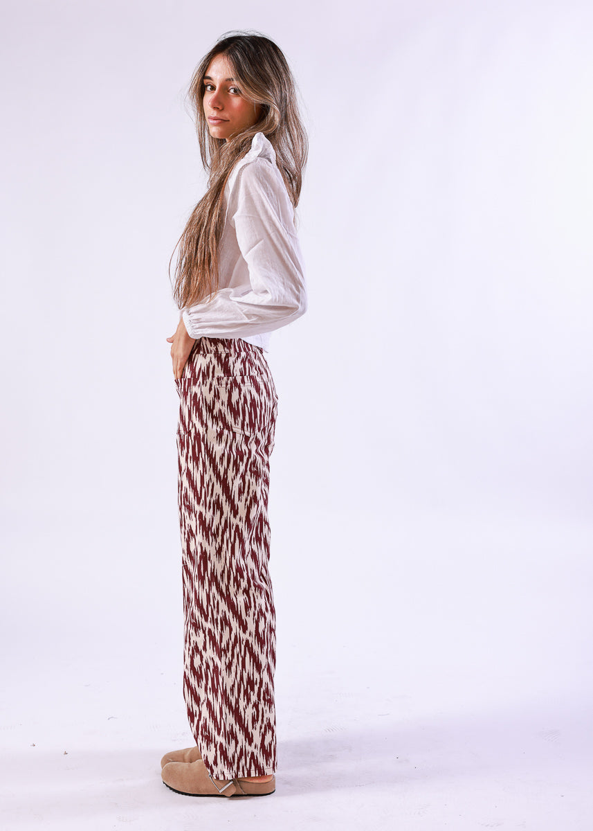 Pantalón de tiro alto con estampado zigzag en tonos rosado y blanco. Corte recto, bolsillos delanteros y cierre frontal con botones visibles.