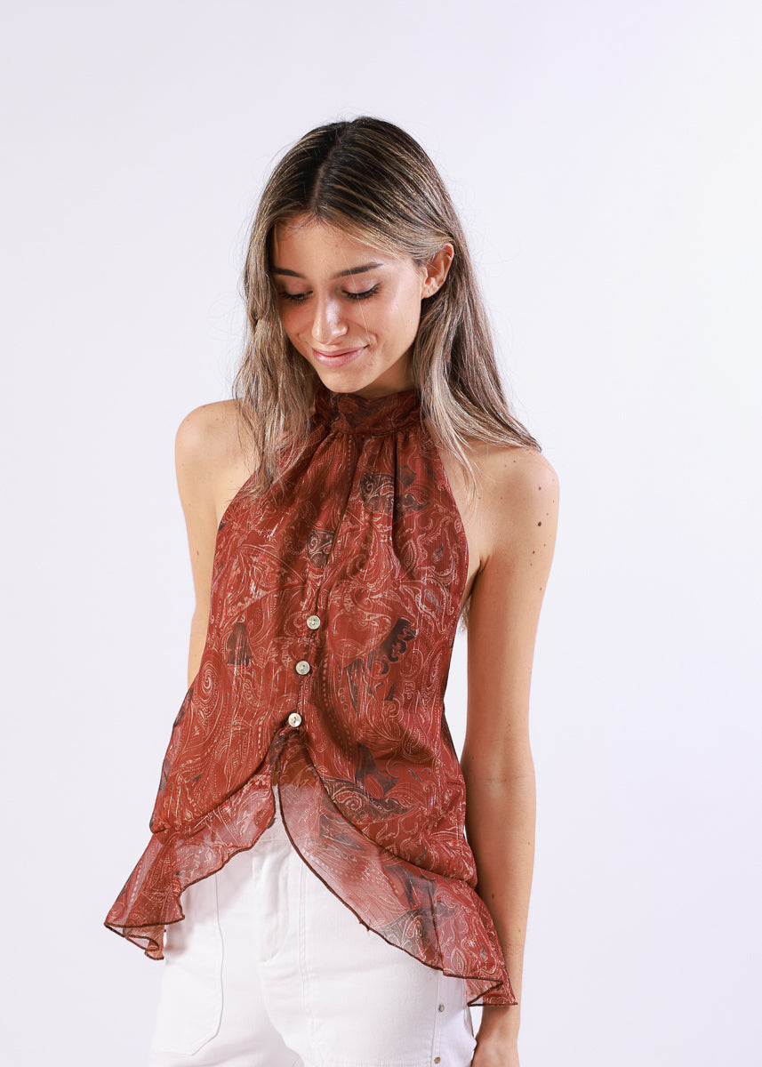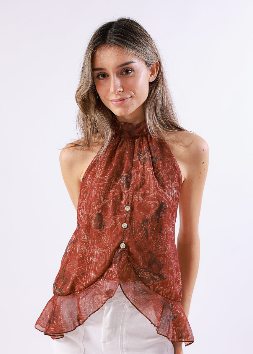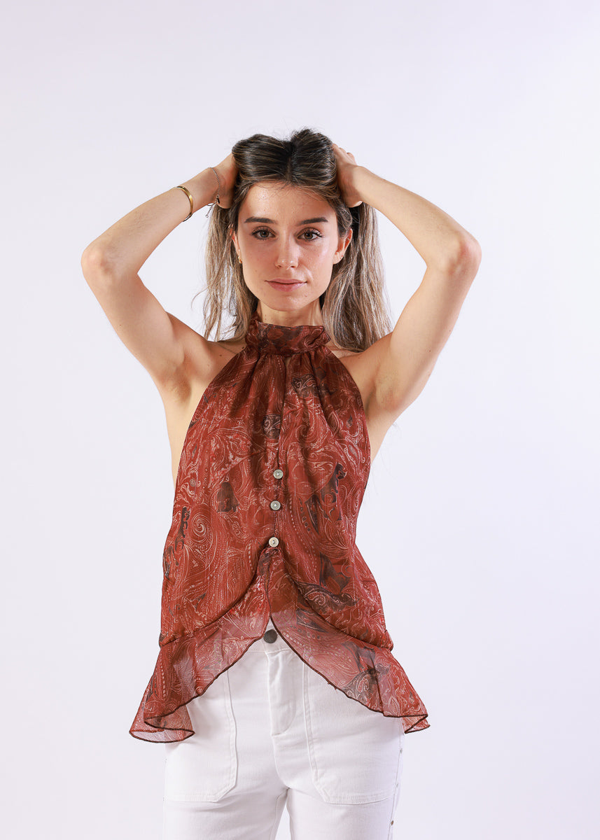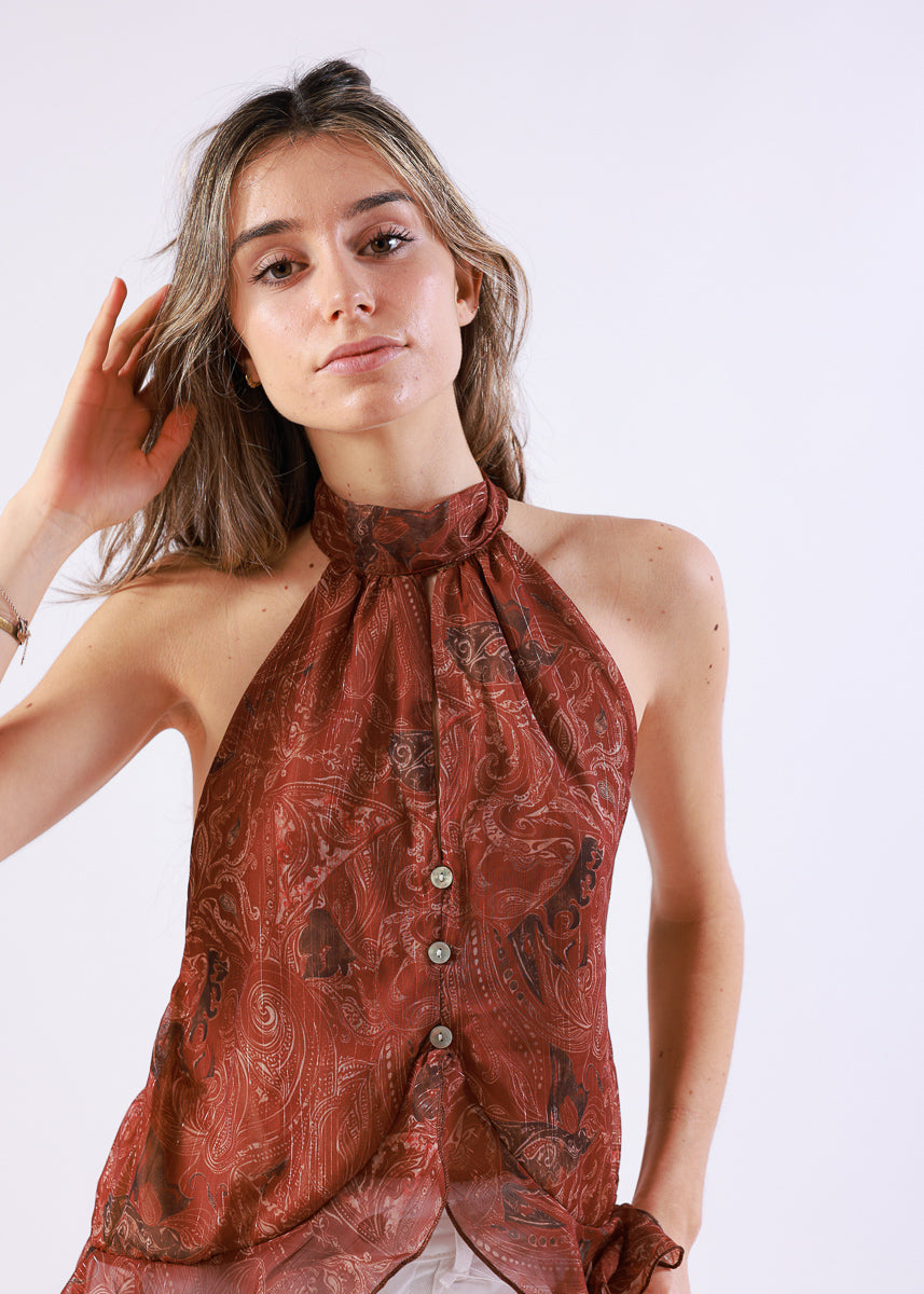 Top halter de tejido ligero y semitransparente con estampado paisley en tono teja. Cuello para lazar y bajo asimétrico con caída fluida. Tiene espalda descubierta.