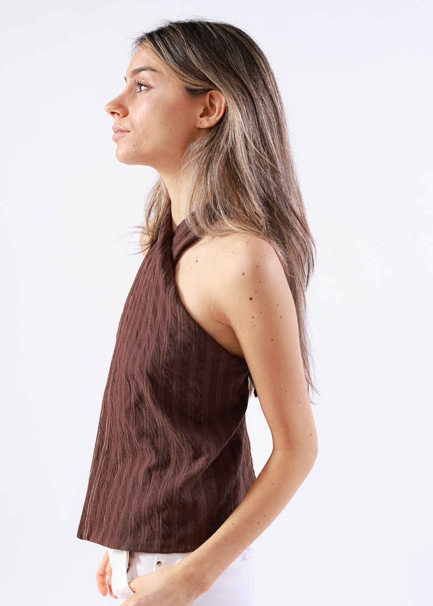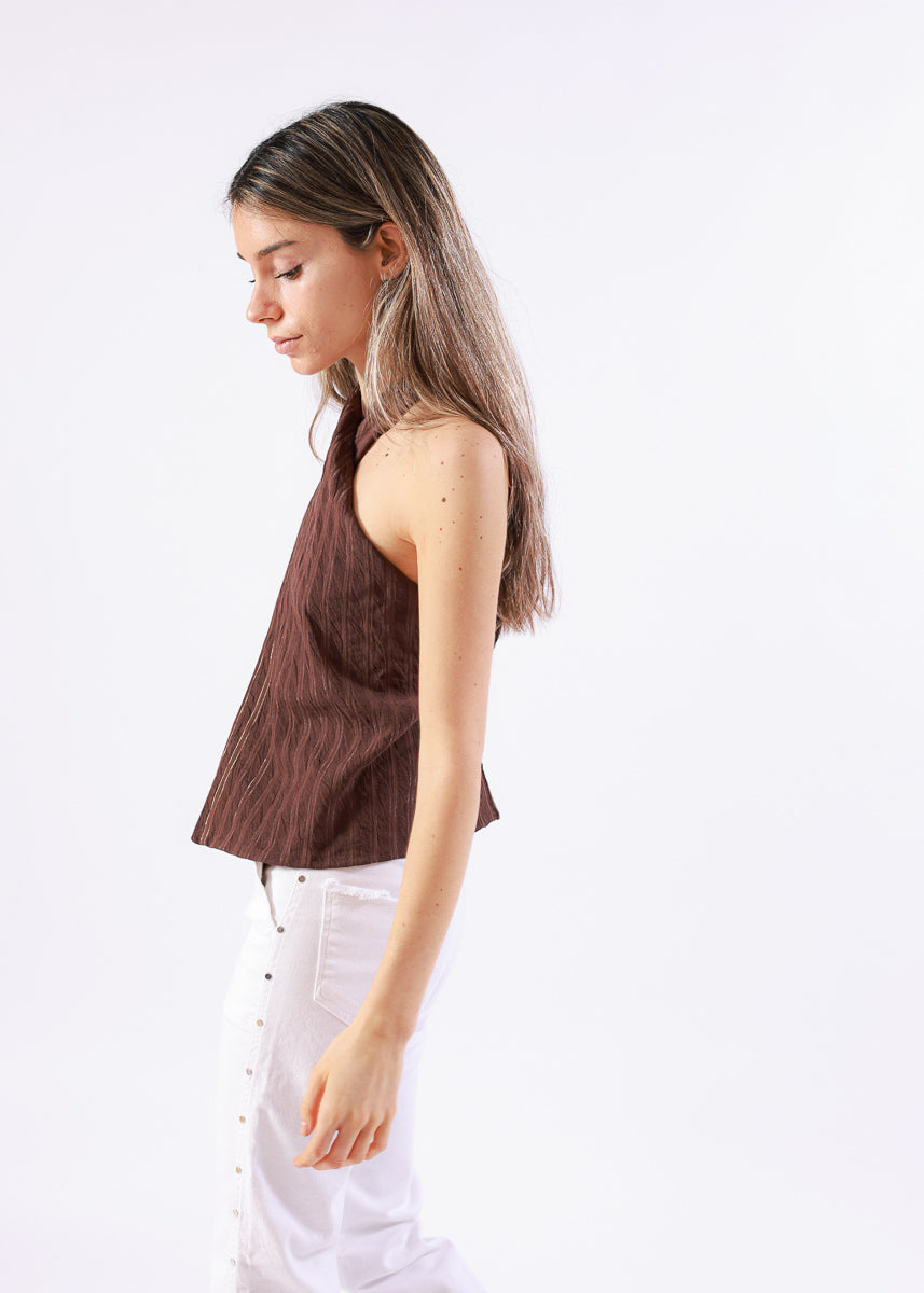 Top halter para armar y anudar al cuello de color marrón con detalle de brillos. Tiene espalda descubierta.