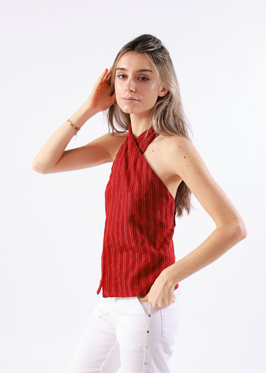 Top halter para armar y anudar al cuello de color rojo con detalle de brillos. Tiene espalda descubierta.