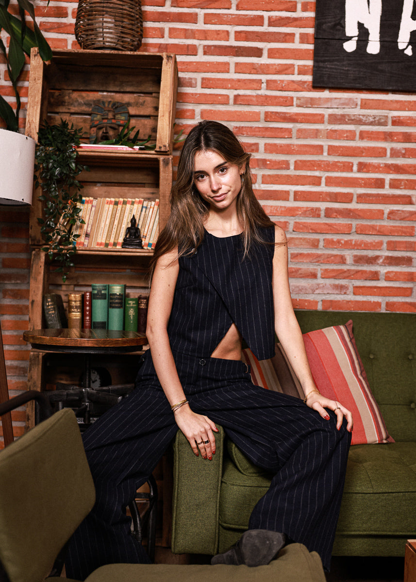 Top corto azul marino de rayas diplomáticas y corte cruzado con detalle de botón en lateral.