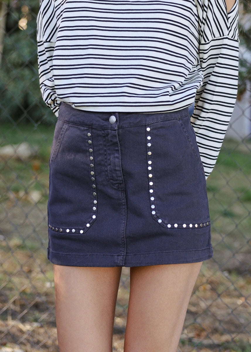 Mini saia com detalhe de tachas redondas prateadas nos bolsos.