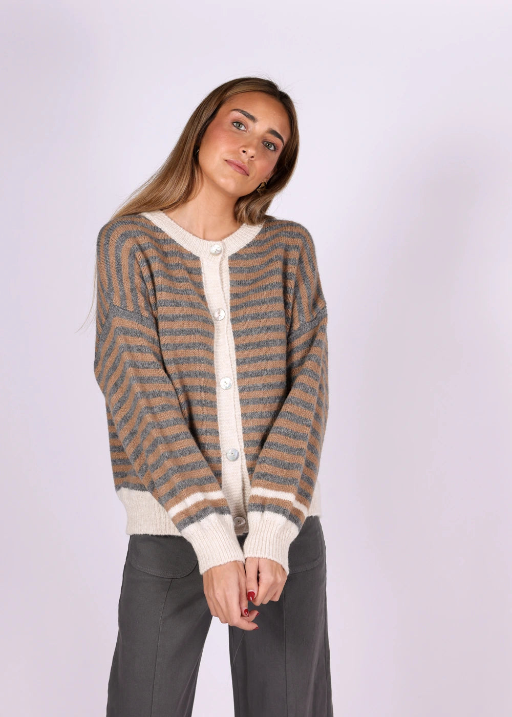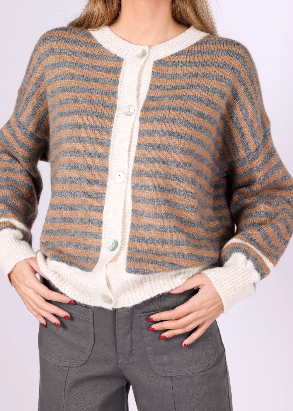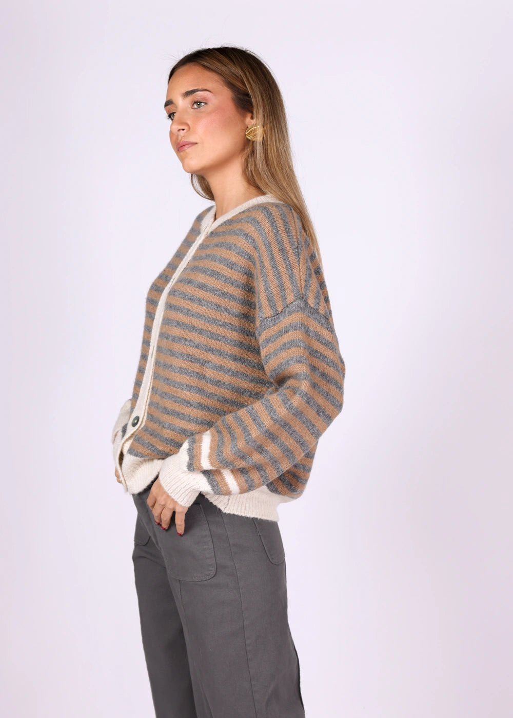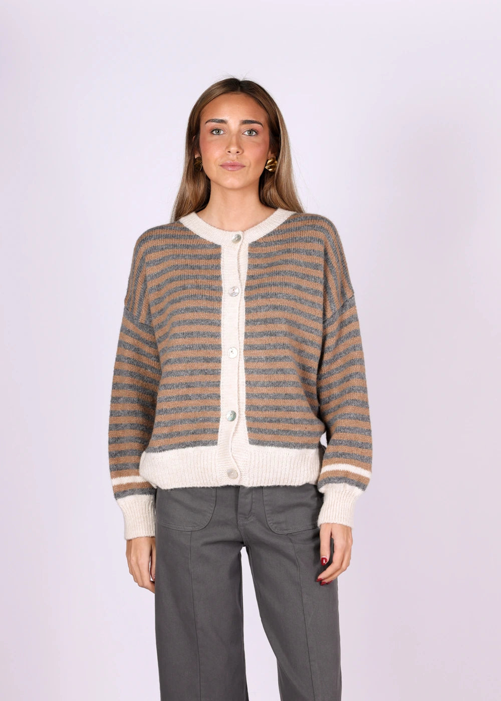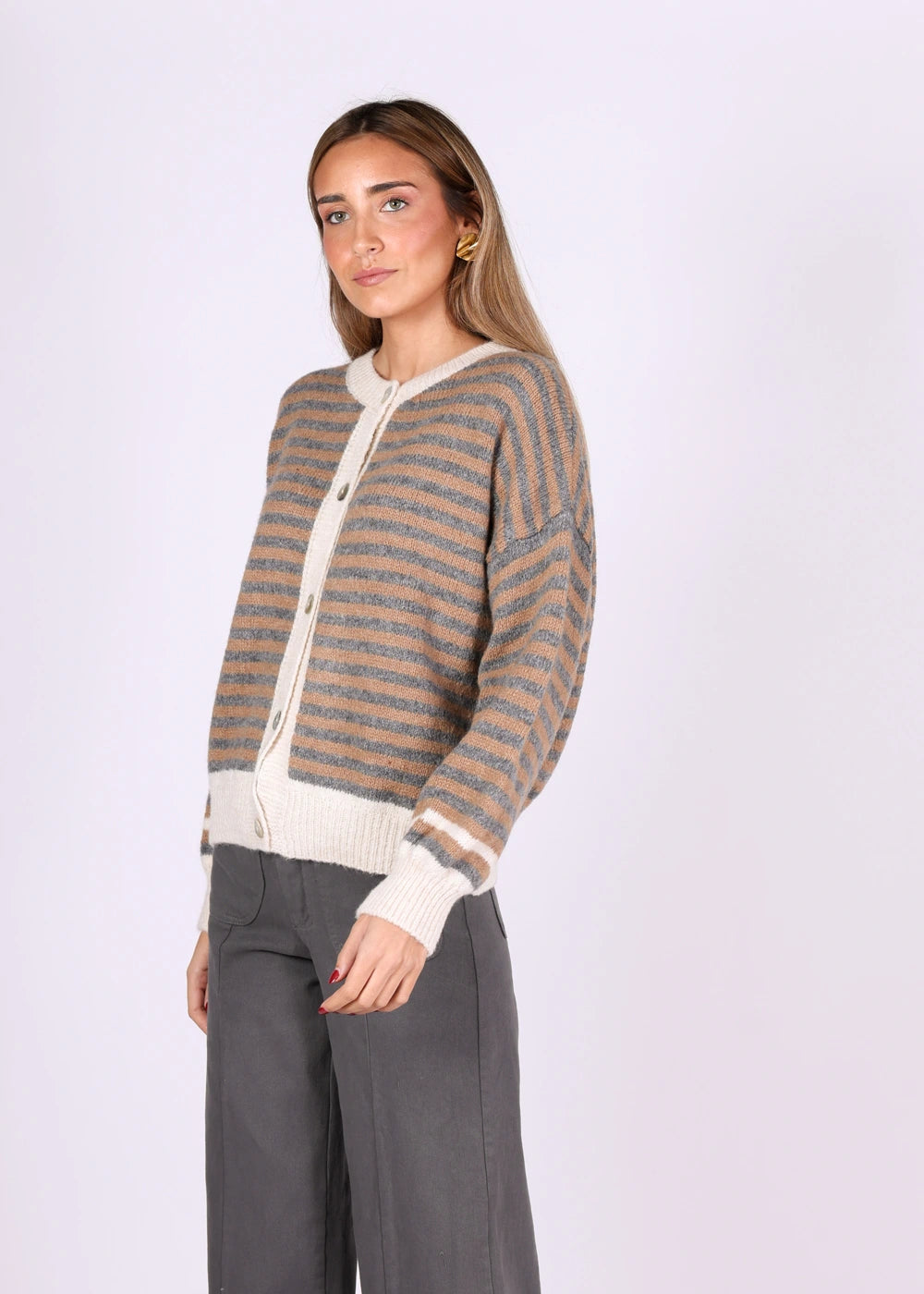 Camisola às riscas em tons bege e cinzento, com botões frontais e detalhes em branco