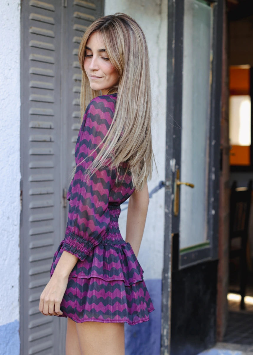 A Blusa Belle é uma peça moderna e sofisticada que se destaca pelo design assimétrico e um toque de brilho sutil, ideal para mulheres que buscam um estilo único e ousado. Com estampa vibrante em tons roxo e preto, essa blusa de manga única proporciona um ar de exclusividade e tendência.