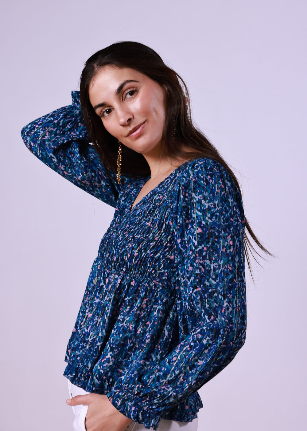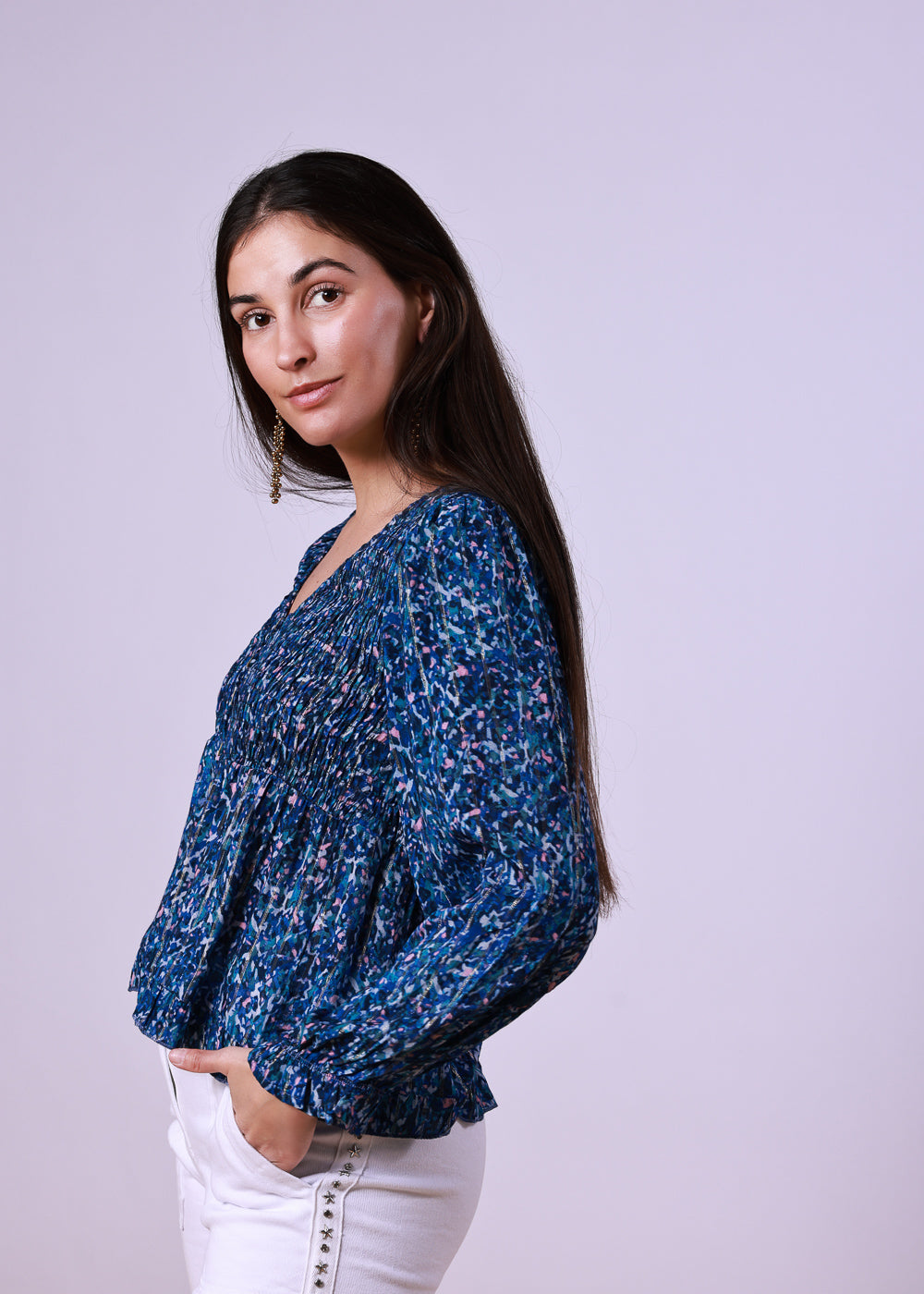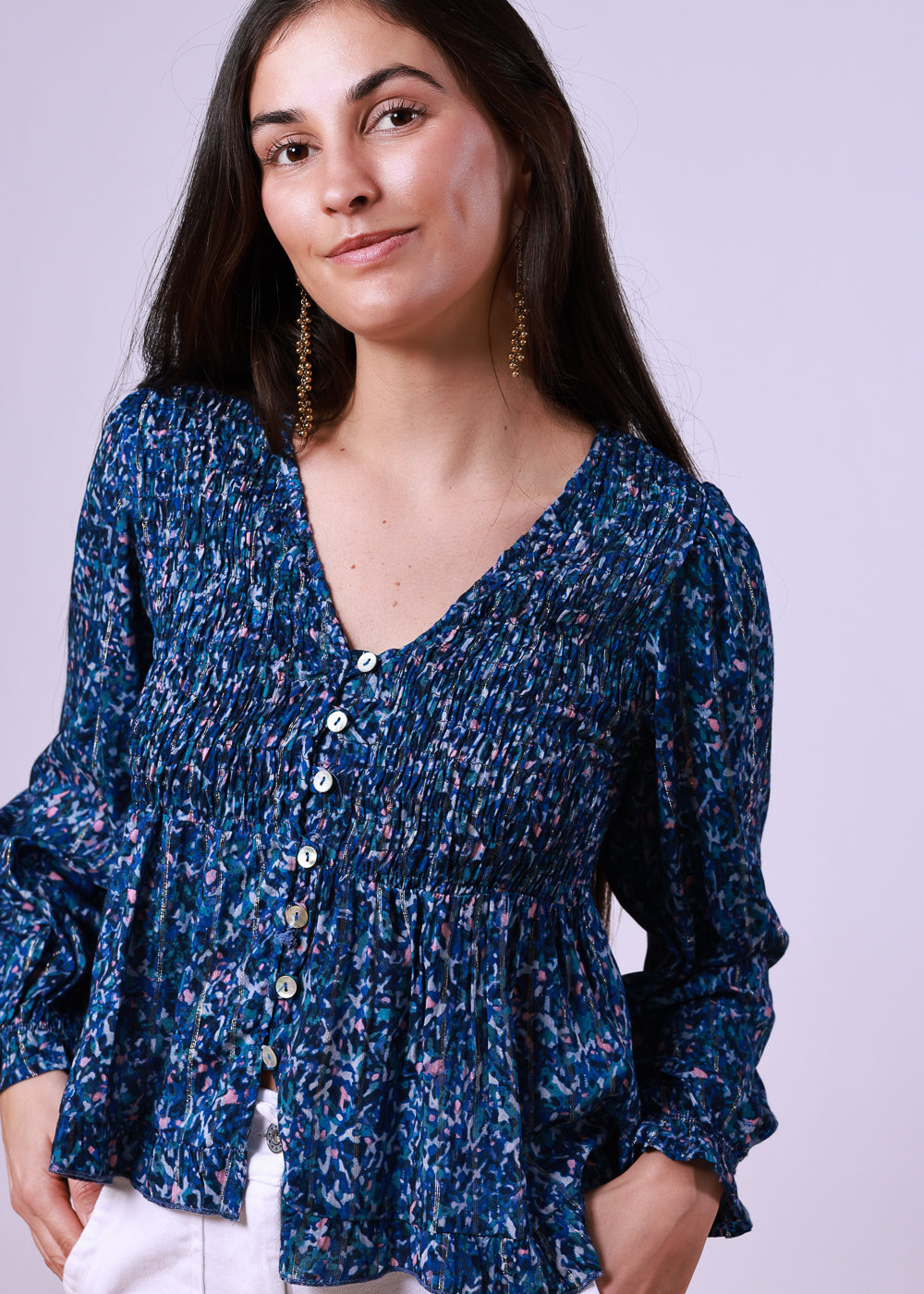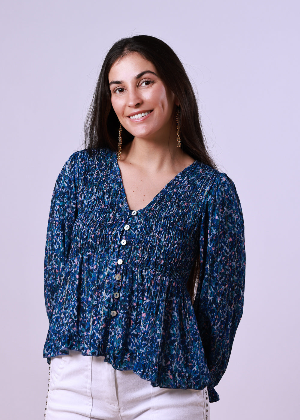 Blusa de manga larga con detalle de brillos y con diseño fruncido en la zona del pecho, botones frontales y escote en pico.