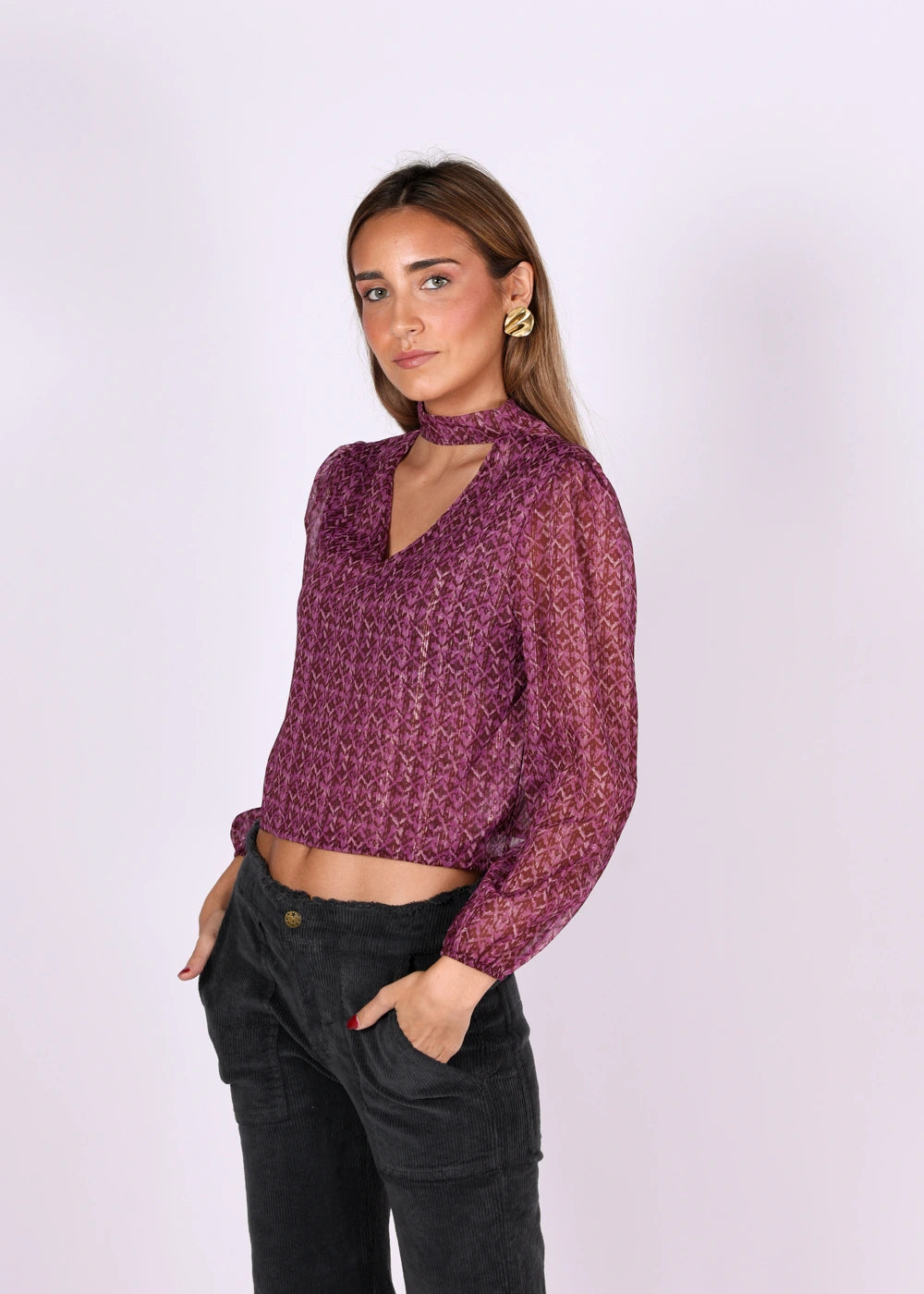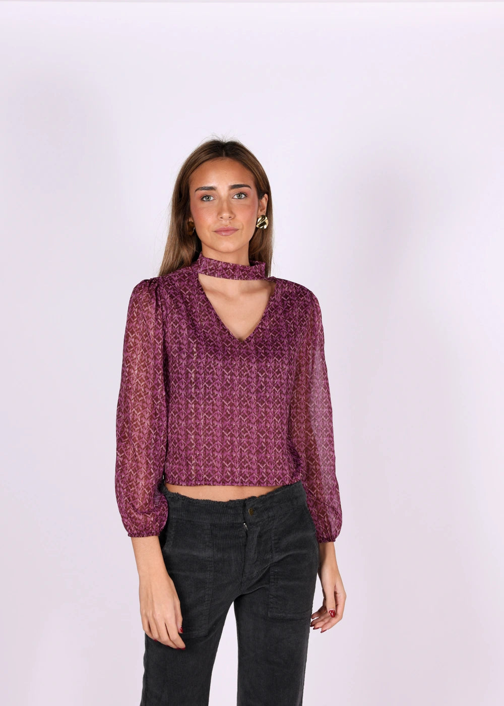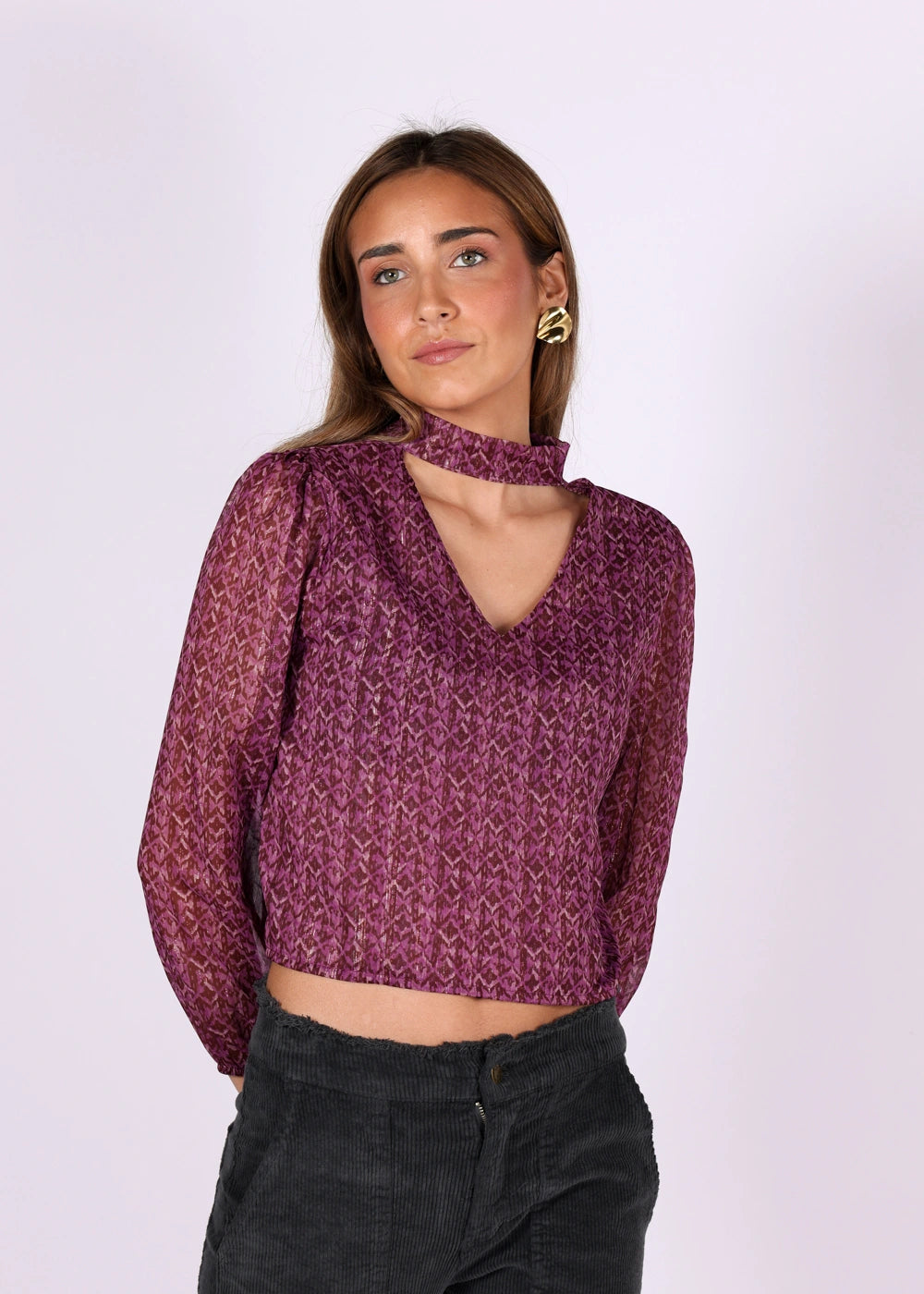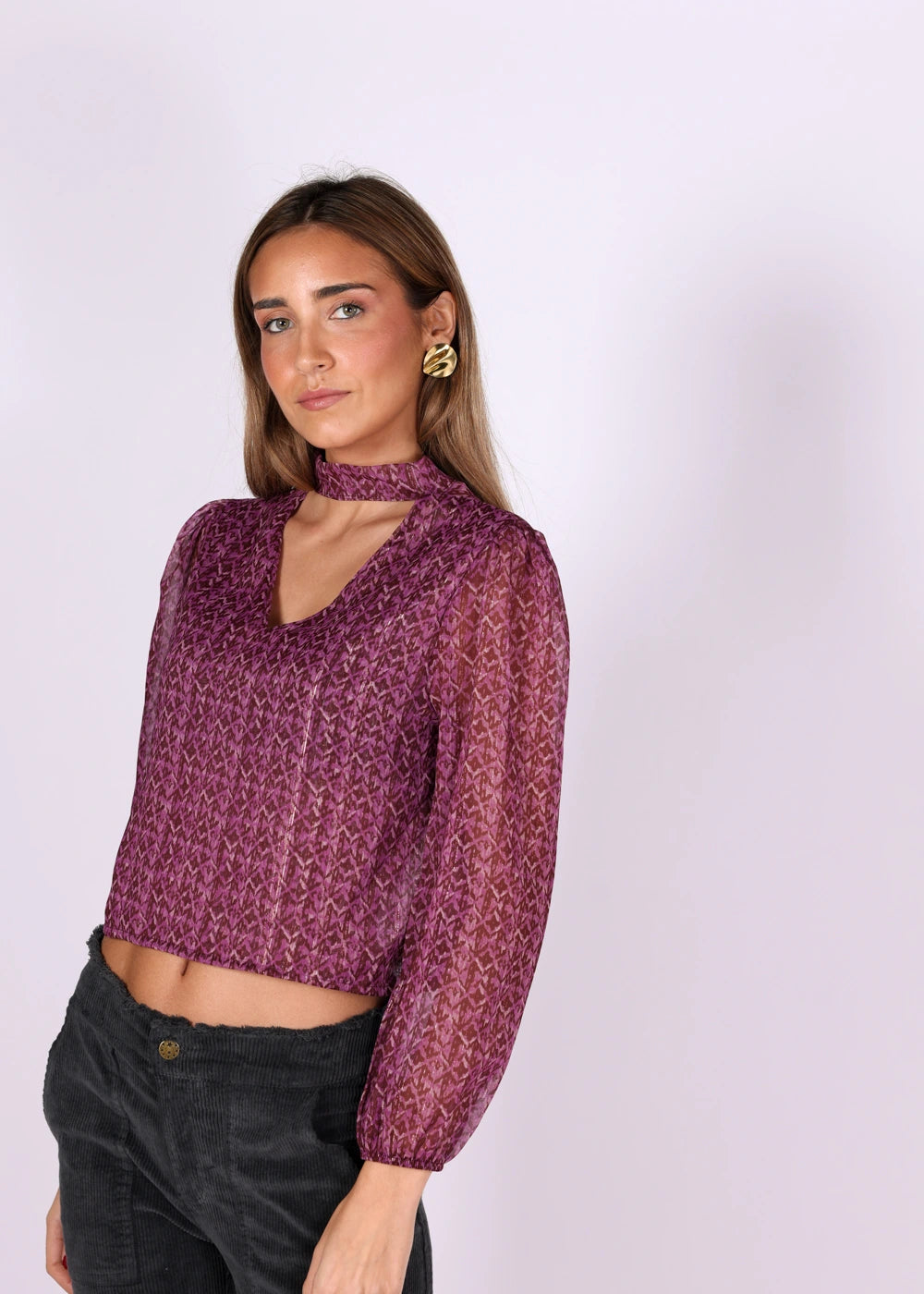 Blusa manga longa estampada com detalhe de brilho e gola gargantilha.