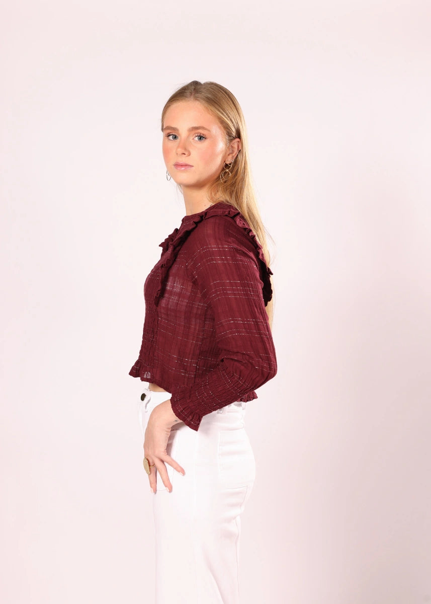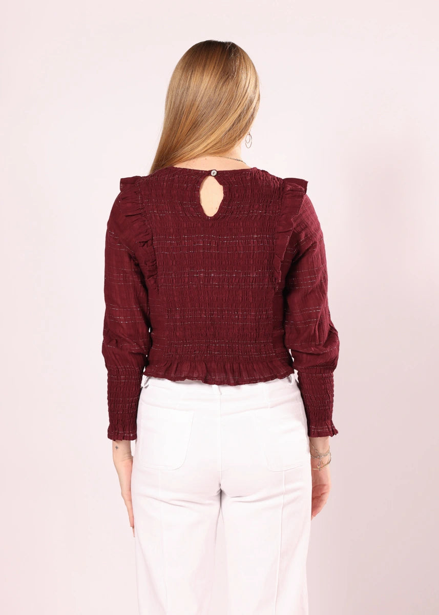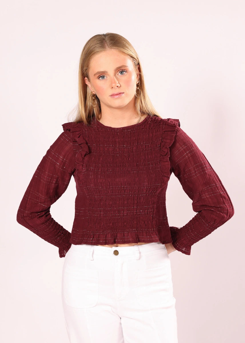 Blusa de cor sólida com brilho. Detalhe franzido no peito e babados nos ombros.