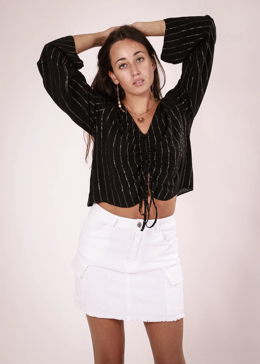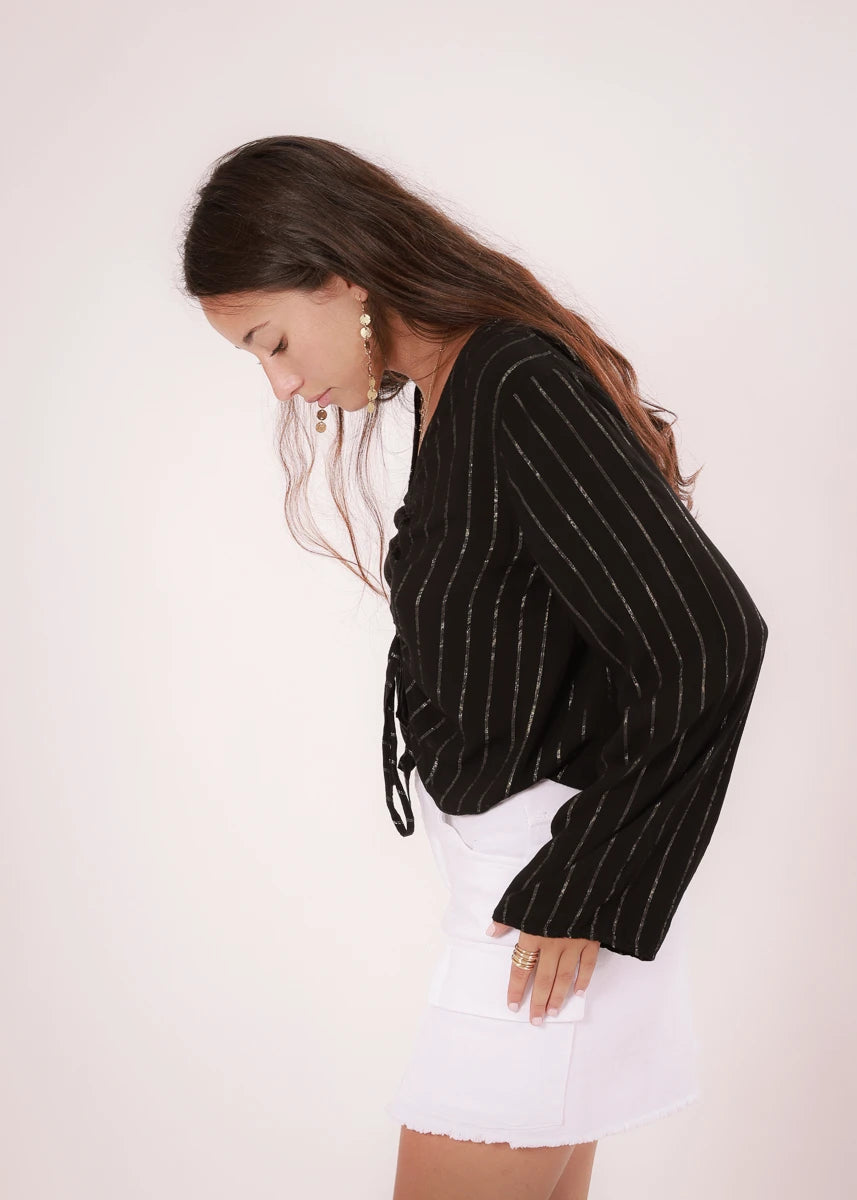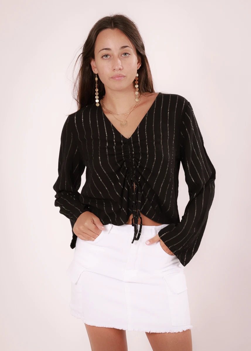 Blusa brilhante com decote em V e atacadores ajustáveis.