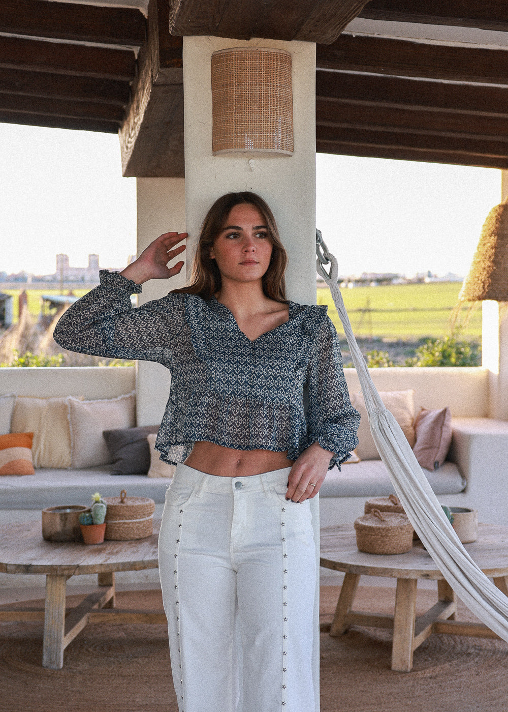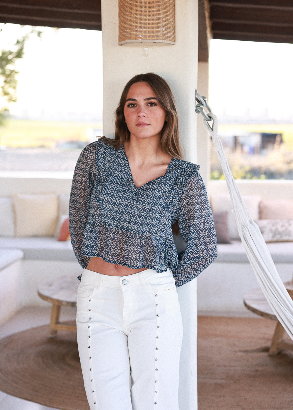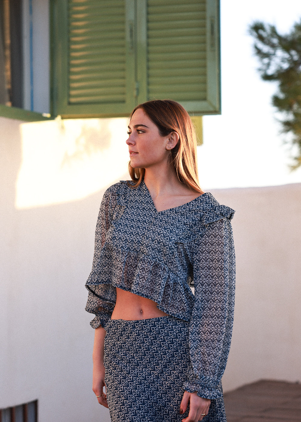 Blusa com estampa geométrica azul com brilho e detalhe de babado no peito e nas mangas.