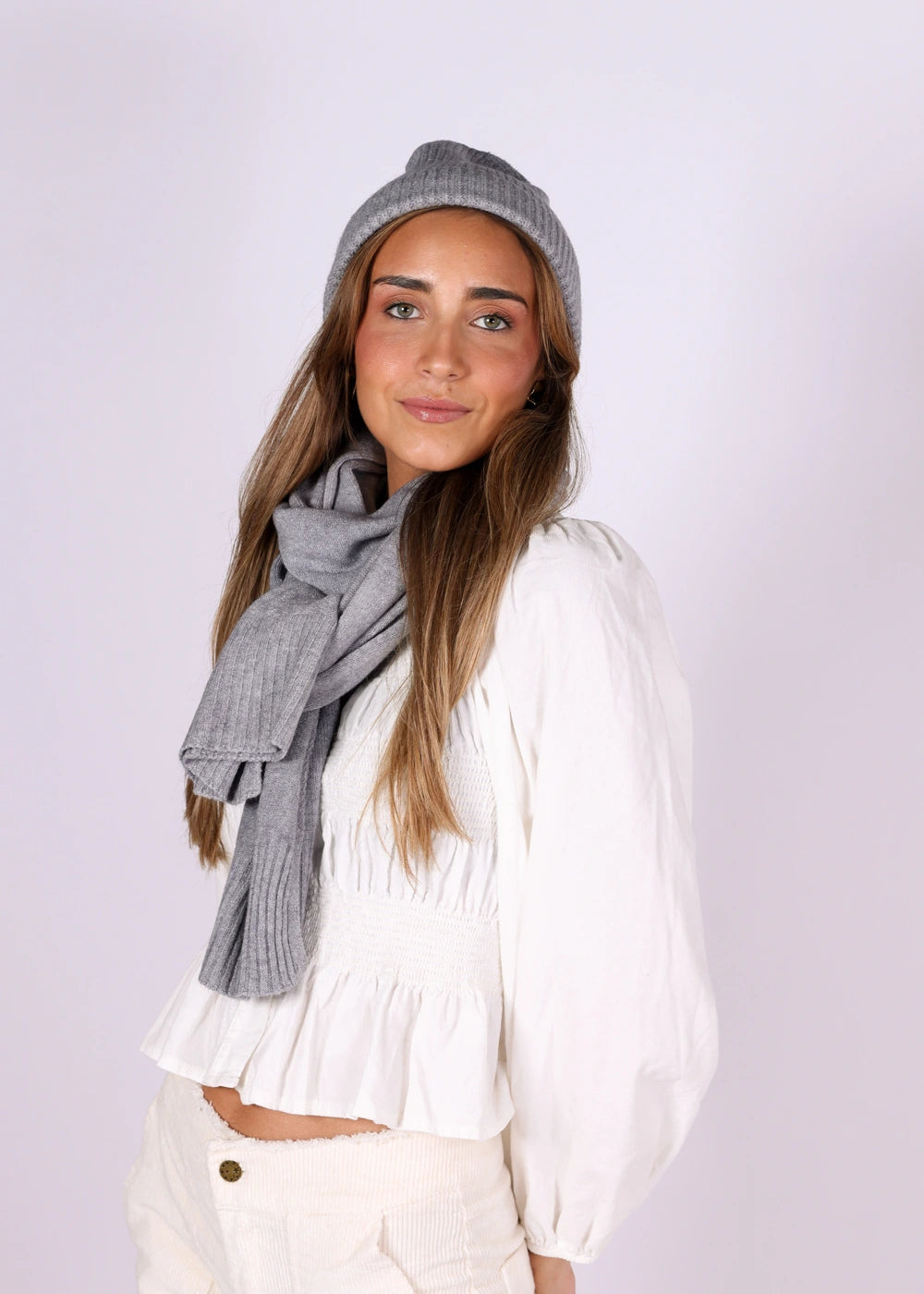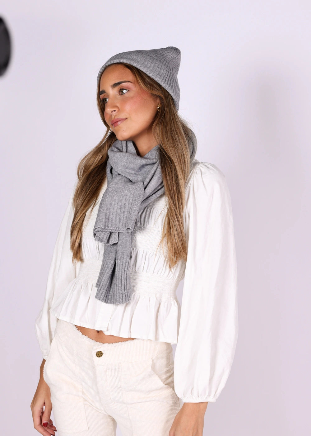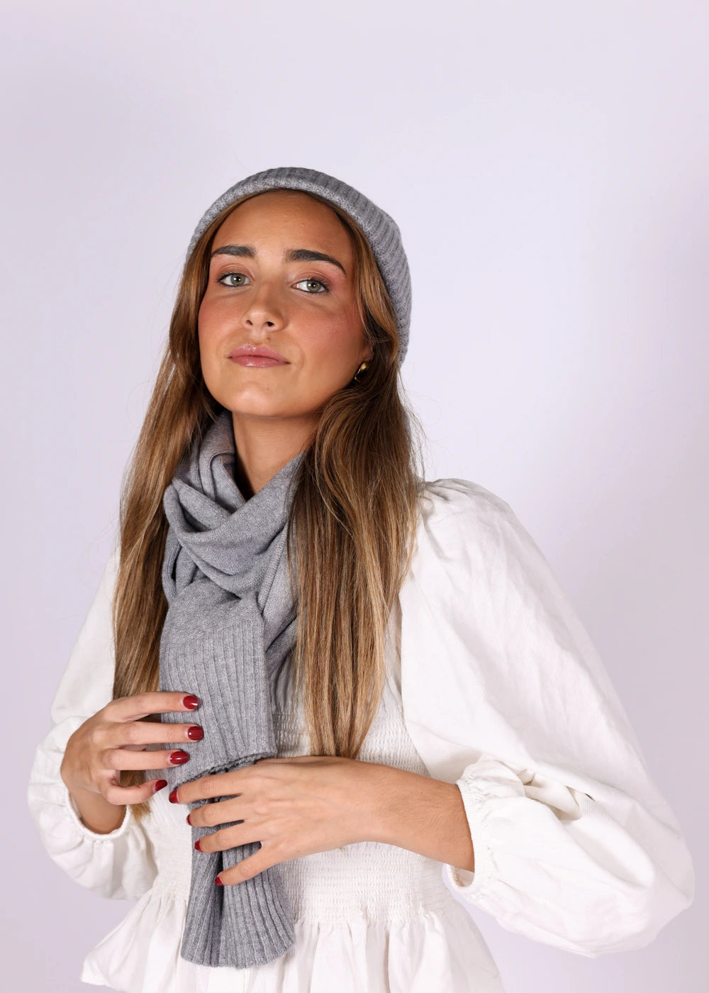 Lenço cinza, ideal para completar o look.