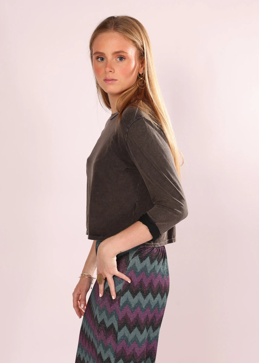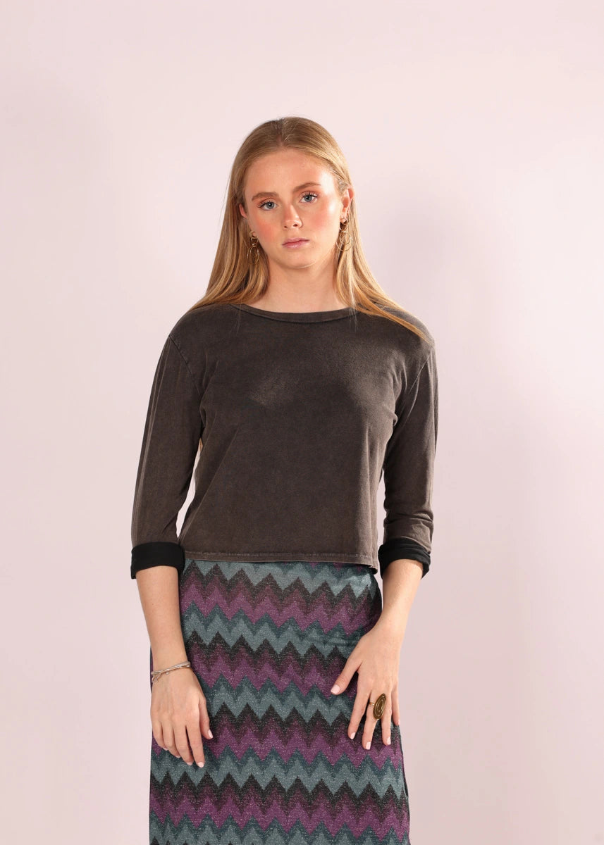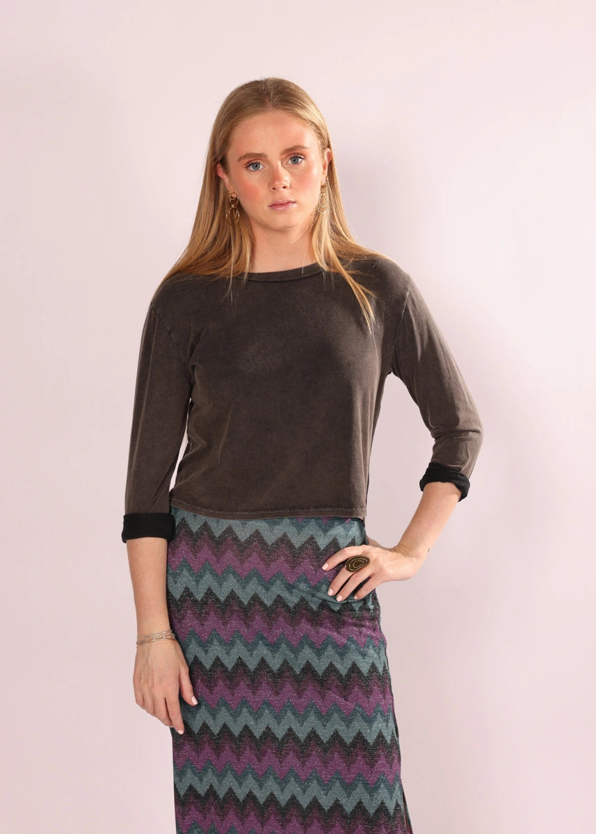 T-shirt básica de cor sólida com mangas compridas e gola redonda.