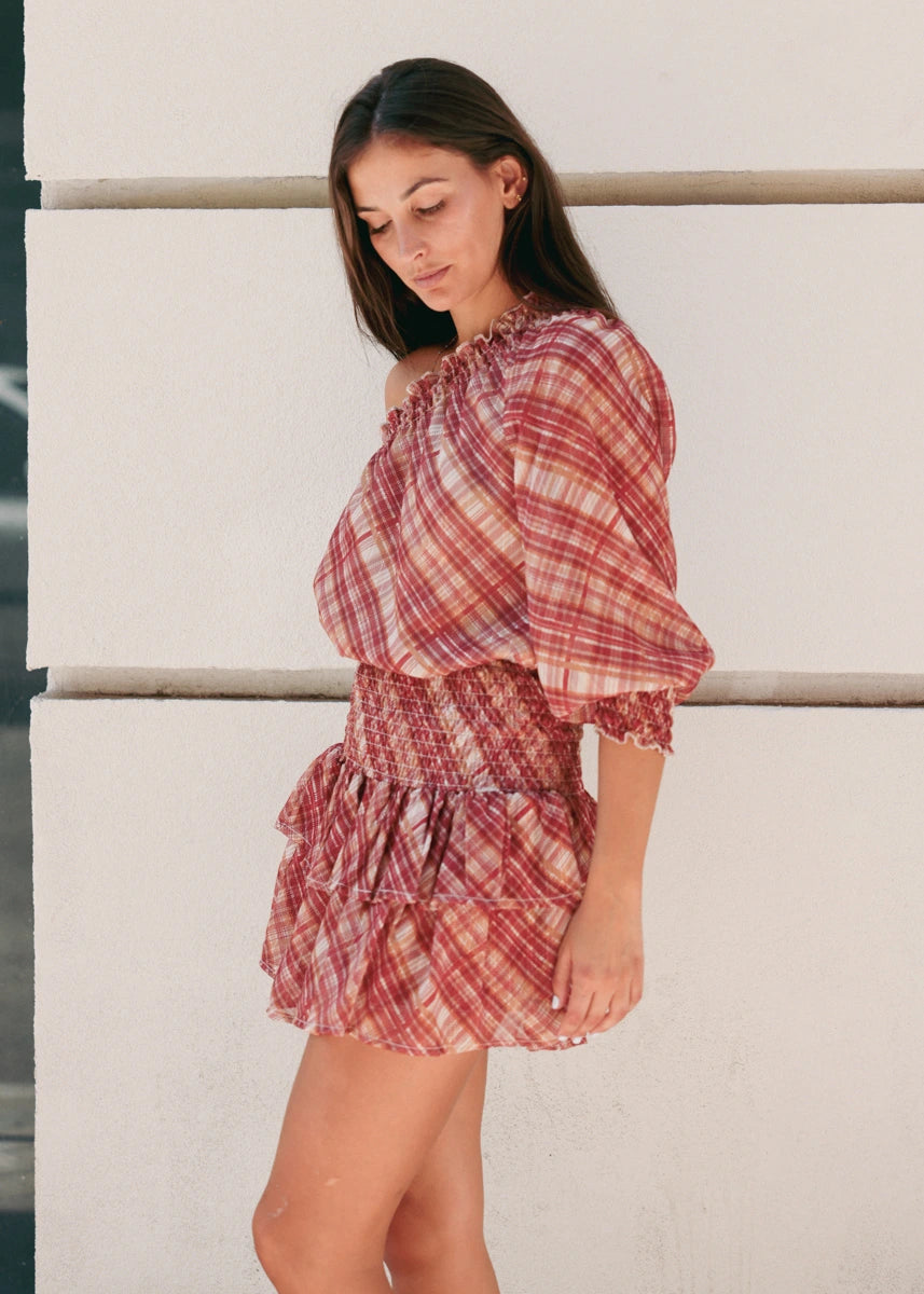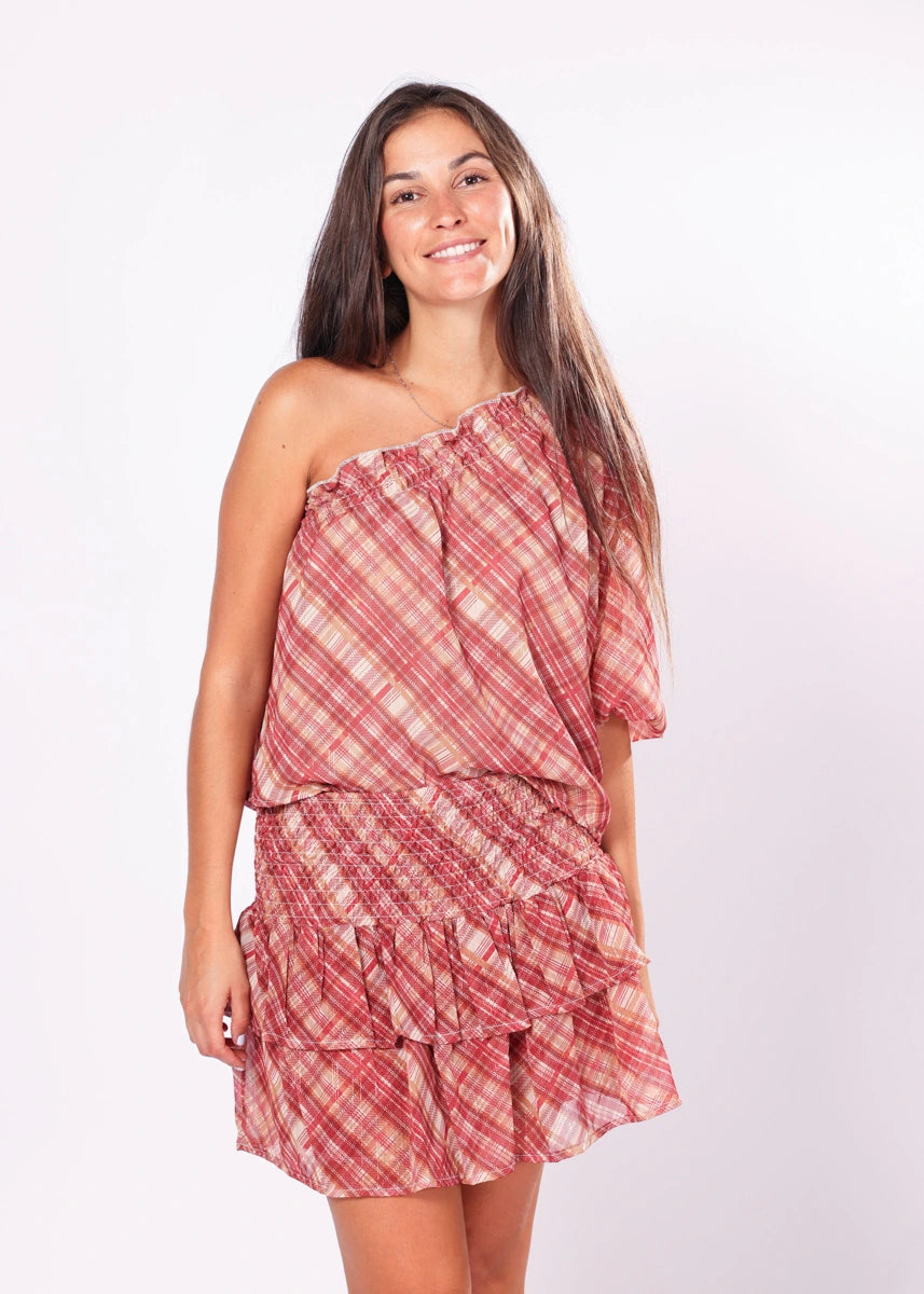 Saia curta com babados estampados em glitter, ajustável na cintura e detalhe de babado.