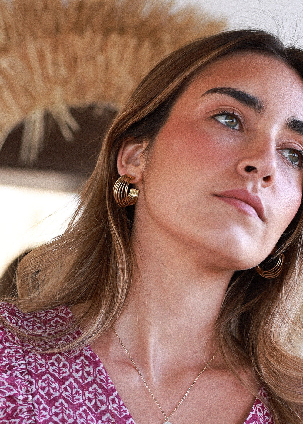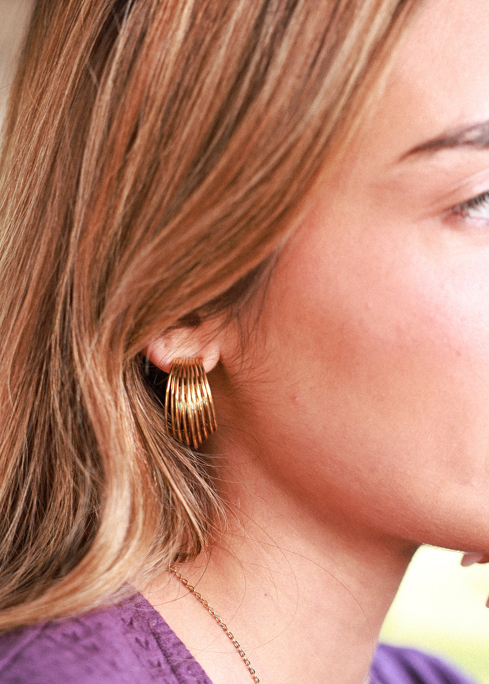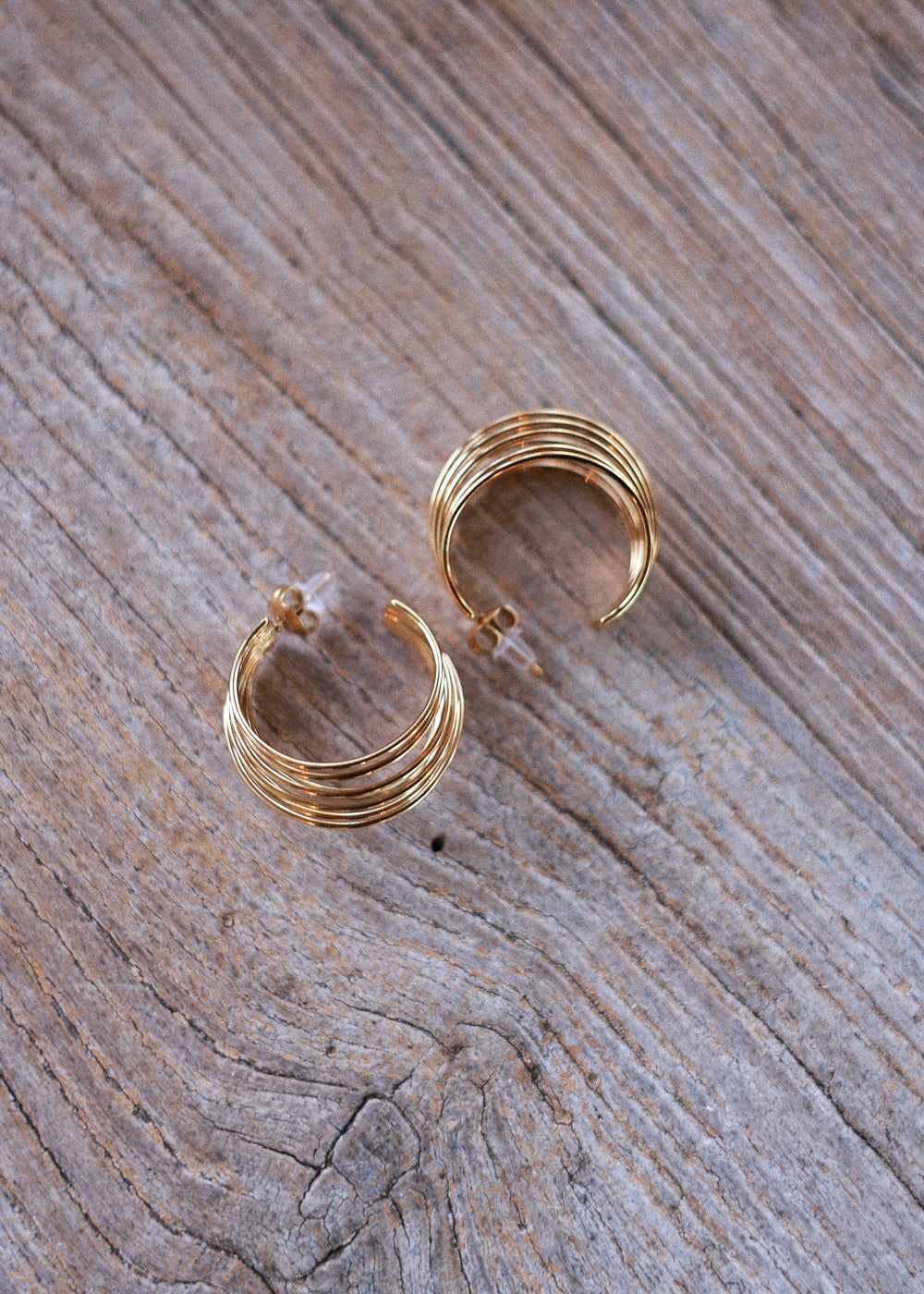 Brincos de argola dourados com linhas finas e sobrepostas que acrescentam um toque sofisticado e versátil.