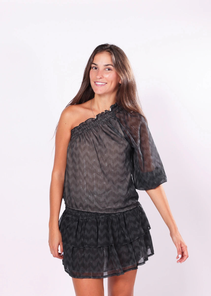 Top assimétrico estampado com glitter sem manga.
